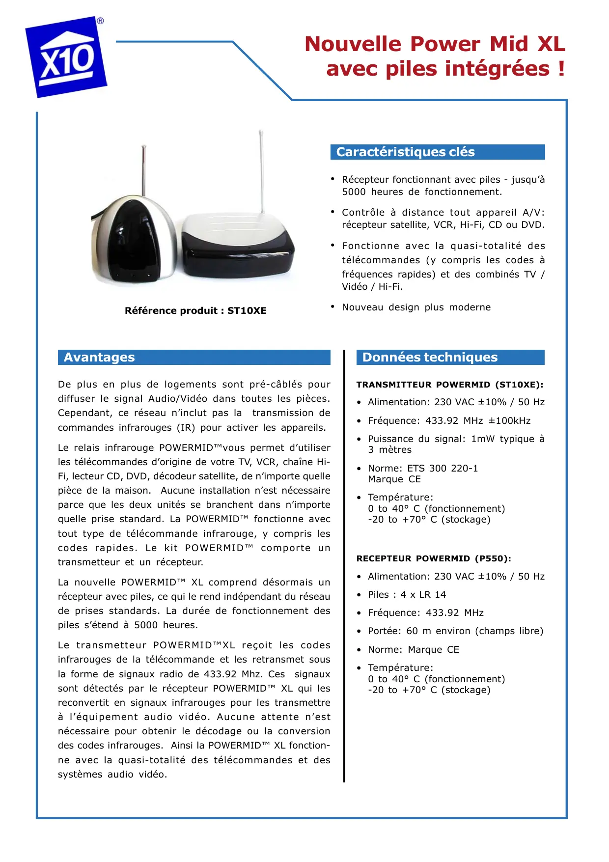 - Température: 0 to 40° C (fonctionnement) -20 to +70° C (stockage) tout type de télécommande infrarouge, y compris les codes rapides. Le kit POWERMID™ comporte un RECEPTEUR POWERMID (P550): transmetteur et un récepteur. La nouvelle POWERMID™ XL comprend désormais un
