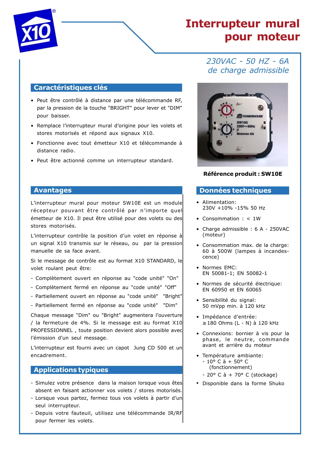 L'interrupteur mural pour moteur SW10E est un module récepteur pouvant être contrôle par n'importe quel émetteur de X10. Il peut être utilisé pour des volets ou des stores motorisés.