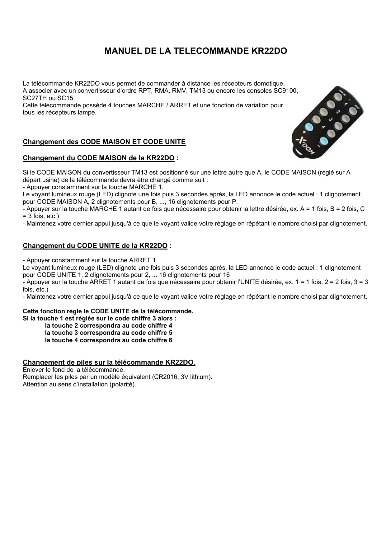 La télécommande KR22DO vous permet de commander à distance les récepteurs domotique. A associer avec un convertisseur d’ordre RPT, RMA, RMV, TM13 ou encore les consoles SC9100, SC27TH ou SC15. Cette télécommande possède 4 touches MARCHE / ARRET et une fonction de variation pour tous les récepteurs lampe. Changement des CODE MAISON ET CODE UNITE Changement du CODE MAISON de la KR22DO : Si le CODE MAISON du convertisseur TM13 est positionné sur une lettre autre que A, le CODE MAISON (réglé sur A départ usine) de la télécommande devra être changé comme suit : - Appuyer constamment sur la touche MARCHE 1. Le voyant lumineux rouge (LED) clignote une fois puis 3 secondes après, la LED annonce le code actuel : 1 clignotement pour CODE MAISON A, 2 clignotements pour B, ..., 16 clignotements pour P. - Appuyer sur la touche MARCHE 1 autant de fois que nécessaire pour obtenir la lettre désirée, ex. A = 1 fois, B = 2 fois, C = 3 fois, etc.) - Maintenez votre dernier appui jusqu'à ce que le voyant valide votre réglage en répétant le nombre choisi par clignotement. Changement du CODE UNITE de la KR22DO : - Appuyer constamment sur la touche ARRET 1. Le voyant lumineux rouge (LED) clignote une fois puis 3 secondes après, la LED annonce le code actuel : 1 clignotement pour CODE UNITE 1, 2 clignotements pour 2, ... 16 clignotements pour 16 - Appuyer sur la touche ARRET 1 autant de fois que nécessaire pour obtenir l’UNITE désirée, ex. 1 = 1 fois, 2 = 2 fois, 3 = 3 fois, etc.) - Maintenez votre dernier appui jusqu'à ce que le voyant valide votre réglage en répétant le nombre choisi par clignotement. Cette fonction règle le CODE UNITE de la télécommande. Si la touche 1 est réglée sur le code chiffre 3 alors : la touche 2 correspondra au code chiffre 4 la touche 3 correspondra au code chiffre 5 la touche 4 correspondra au code chiffre 6 Changement de piles sur la télécommande KR22DO. Enlever le fond de la télécommande. Remplacer les piles par un modèle équivalent (CR2016, 3V lithium). Attention au sens d’installation (polarité).