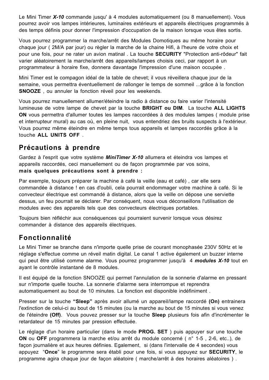 Gardez à l'esprit que votre système MiniTimer X-10 allumera et éteindra vos lampes et appareils raccordés, que manuellement ou de façon programmée par vos soins, mais quelques précautions sont à prendre :
