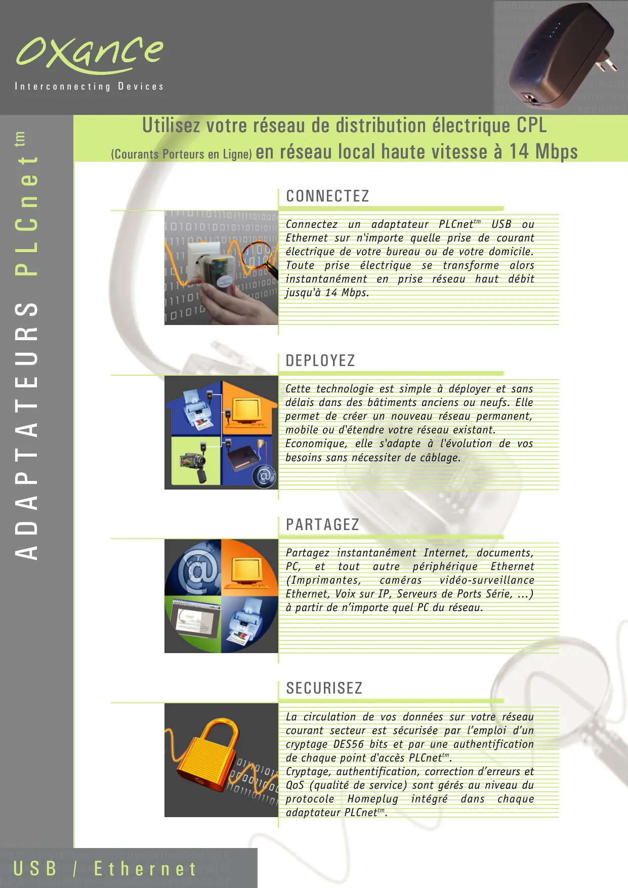 Connectez un adaptateur PLCnet tm USB ou Ethernet sur n'importe quelle prise de courant électrique de votre bureau ou de votre domicile. Toute prise électrique se transforme alors instantanément en prise réseau haut débit jusqu'à 14 Mbps.