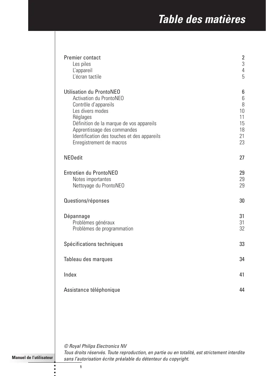 page précédente et suivante, 4, 10 page, numéro 5, 10 paramétrage, 11 personnalisation paramétrage, 11 définition des marques, 15 apprentissage des commandes, 18 NEOedit, 27 enregistrement de macros, 23 identification des touches et des appareils, 21 Philips, site Web 2 piles, 3 première utilisation nettoyage, 29 informations, 14 réinitialisation, 14 programmation, Voir personnalisation