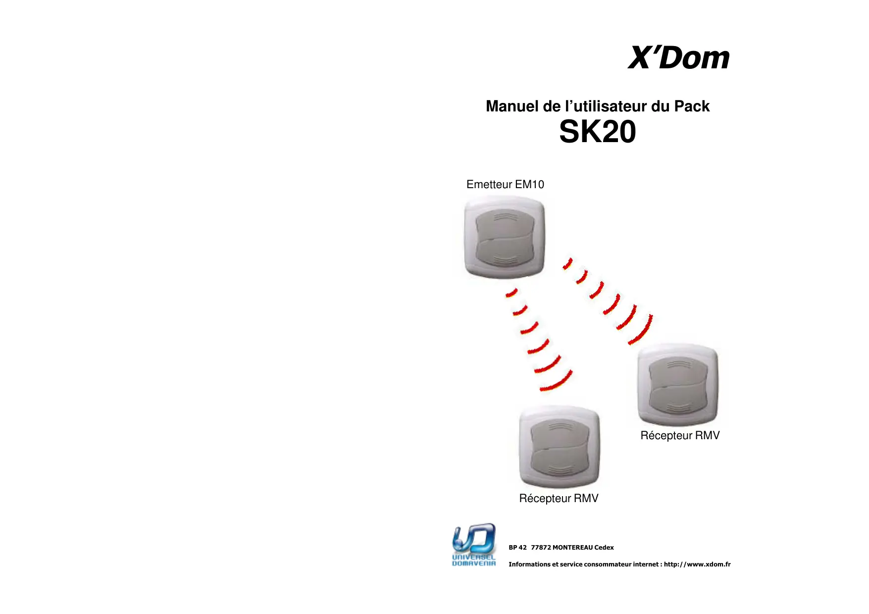 X’Dom Manuel de l’utilisateur du Pack SK20 Emetteur EM10 Récepteur RMV Récepteur RMV BP 42 77872 MONTEREAU Cedex Informations et service consommateur internet : http://www.xdom.fr CONTENU 1.INTRODUCTION...........................................................................................p.1 2.TOUR RAPIDE..............................................................................................p.2 1.Description de l’émetteur EM10.................................................p.2 2.Description du récepteur RMV.....................................................p.3 3.INSTALLATION RECEPTEUR RMV...........................................................p.3 4.INITIALISATION AVEC UN RECEPTEUR RMV DE LA GAMME .....p.4 5.INITIALISATION AVEC UN RECEPTEUR X’DOM.....................................p.5 1.Régler le CODE MAISON & le CODE UNITE............................p.5 1.1. Régler le CODE MAISON............................................p.5 1.2. Régler le CODE UNITE...............................................p.5 2.Vérification des codes mémorisés............................................p.6 6.INSTALLATION EMETTEUR EM10............................................................p.6 7.DESINITIALISATION....................................................................................p.6 1.Désinitialiser un émetteur sur un récepteur.............................p.6 2.Désinitialiser tous les émetteurs sur un récepteur................p.6 8.AUTRES........................................................................................................p.7 9.ZONING..........................................................................................................p.7 10.DONNEES TECHNIQUES.........................................................................p.8 1.INTRODUCTION Vous venez d’acquérir un appareil de haute technologie. La mise en service de ces appareils nécessite la lecture attentive de ce mode d’emploi. Vous y trouverez toutes les informations et explications nécessaires pour utiliser ce pack. Dans le cas où des problèmes surviendraient, informez immédiatement votre revendeur. Conservez ce mode d’emploi pour vous y reporter ultérieurement. Le pack SK20 X’Dom vous permet de piloter à distance grâce à l’émetteur EM10 plusieurs récepteurs RMV et l’ensemble des récepteurs domotique X’Dom (pour information, l’ensemble de la gamme X’Dom utilise le protocole de communication X10 standard industriel le plus répendu). Il permet de commander des volets roulants, des volets battants, store banne ou encore un écran Home Cinéma. Vous pourrez également effectuer du ZONING (centralisation zone par zone, ex: zone Rez de Chaussée) de volets roulants en faisant reconnaître l’émetteur EM10 sur chaque récepteur RMV des volets prévus dans votre ZONING. Utilisation prévue. L’émetteur EM10 et le récepteur RMV sont conçus pour fonctionner dans un local sec, en intérieur. Les conditions d’humidité et de température extrèmes doivent être évitées. Le pack SK20 est conforme aux normes CE et aux différentes réglementations nationales. PAGE 1 Précaution d’emploi. Tout maniement incorrect expose l’utilisateur à des risques d’accidents électriques. Garantie limitée. Le produit ne doit pas être modifié ou démonté. Toute intervention de contrôle sur les appareils doit être réalisée par un technicien compétent. Les instructions de sécurité et de montage doivent être respectées. Les valeurs électriques caractéristiques doivent être systématiquement respectées, notamment pour la tension de mise en service. En cas de dommage imputables au non respect du mode d’emploi ou des clauses précédentes, la garantie ne s’applique pas, et nous ne pouvons être tenus responsables des préjudices ainsi causés. Introduction Le pack SK20 X’Dom comprend un émetteur sans fil EM10 (commande murale) et deux récepteurs RMV. Il permet de piloter à distance grâce à l’émetteur EM10 plusieurs récepteurs RMV et l’ensemble des récepteurs domotique X’Dom. Vous pourrez commander des volets roulants, des volets battants, store banne ou encore un écran Home Cinéma et la gamme des récepteurs domotique X’Dom. Vous pourrez également effectuer une centralisation de volet roulant en faisant reconnaître l’émetteur EM10 sur chaque récepteur RMV des volets prévus dans votre centralisation. Il est possible d’effectuer du zoning, exemple centralisation des volets roulants de votre Rez de Chaussée et une autre centralisation pour votre premier étage. (voir page 7) Les signaux sont transmis par radio fréquence sécurisée 433.92 MHz. Selon le nombre et l’épaisseur des parois à traverser, la distance de transmission entre émetteur EM10 et récepteur RMV peut aller jusqu’à 100 mètres en champ libre et selon les conditions environnantes. 2.TOUR RAPIDE