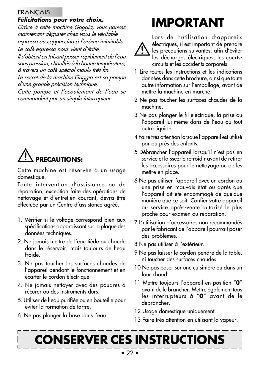 FRANÇAIS Félicitations pour votre choix. Grâce à cette machine Gaggia, vous pouvez maintenant déguster chez vous le véritable espresso ou cappuccino à larôme inimitable. Le café espresso nous vient dItalie. Il sobtient en faisant passer rapidement de leau sous pression, chauffée à la bonne température, à travers un café spécial moulu très fin. Le secret de la machine Gaggia est sa pompe dune grande précision technique. Cette pompe et lécoulement de leau se commandent par un simple interrupteur.