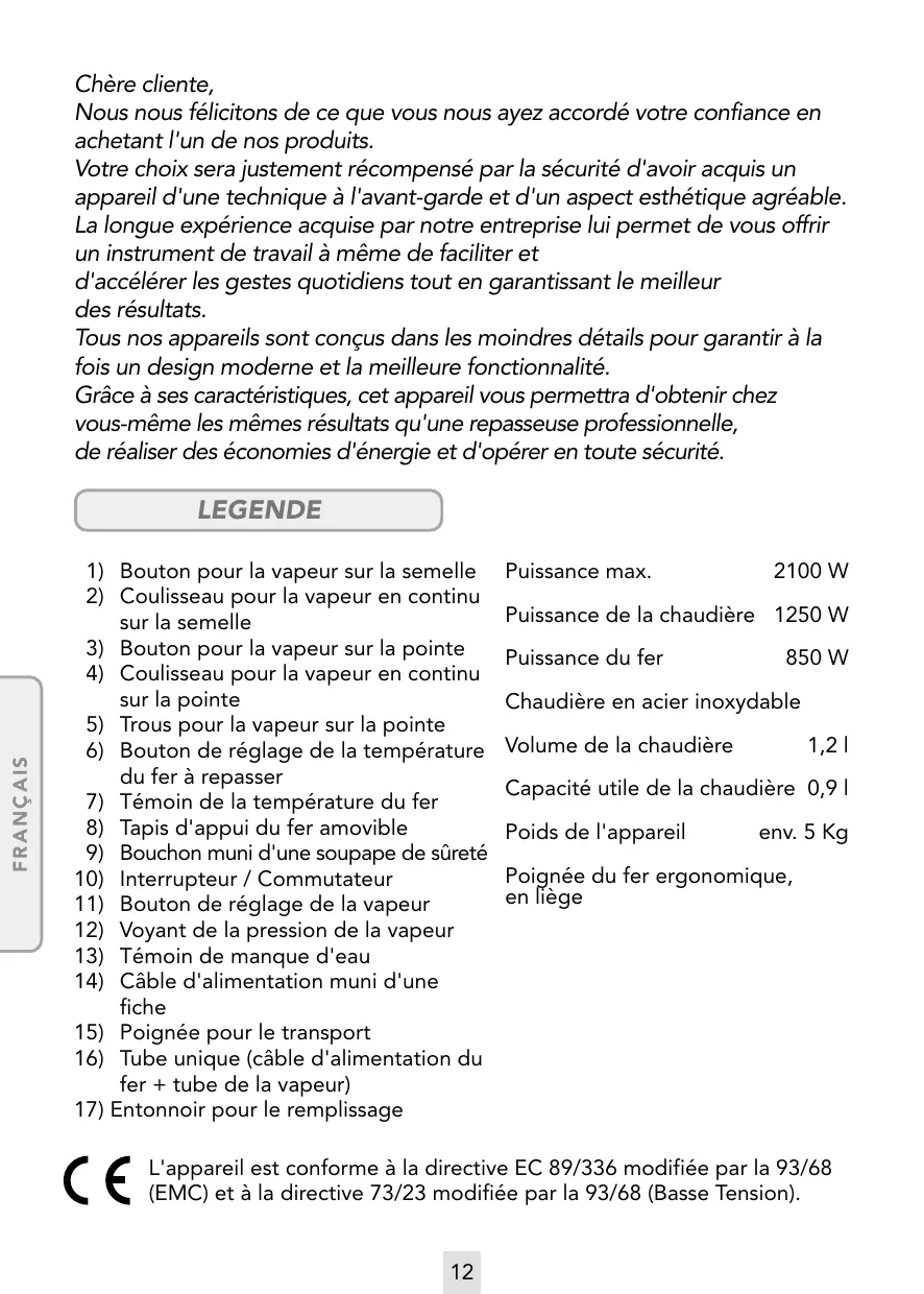 1) Bouton pour la vapeur sur la semelle 2) Coulisseau pour la vapeur en continu sur la semelle 3) Bouton pour la vapeur sur la pointe 4) Coulisseau pour la vapeur en continu sur la pointe 5) Trous pour la vapeur sur la pointe 6) Bouton de réglage de la température du fer à repasser 7) Témoin de la température du fer 8) Tapis d'appui du fer amovible 9) Bouchon muni d'une soupape de sûreté 10) Interrupteur / Commutateur 11) Bouton de réglage de la vapeur 12) Voyant de la pression de la vapeur 13) Témoin de manque d'eau 14) Câble d'alimentation muni d'une fiche 15) Poignée pour le transport 16) Tube unique (câble d'alimentation du fer + tube de la vapeur) 17) Entonnoir pour le remplissage