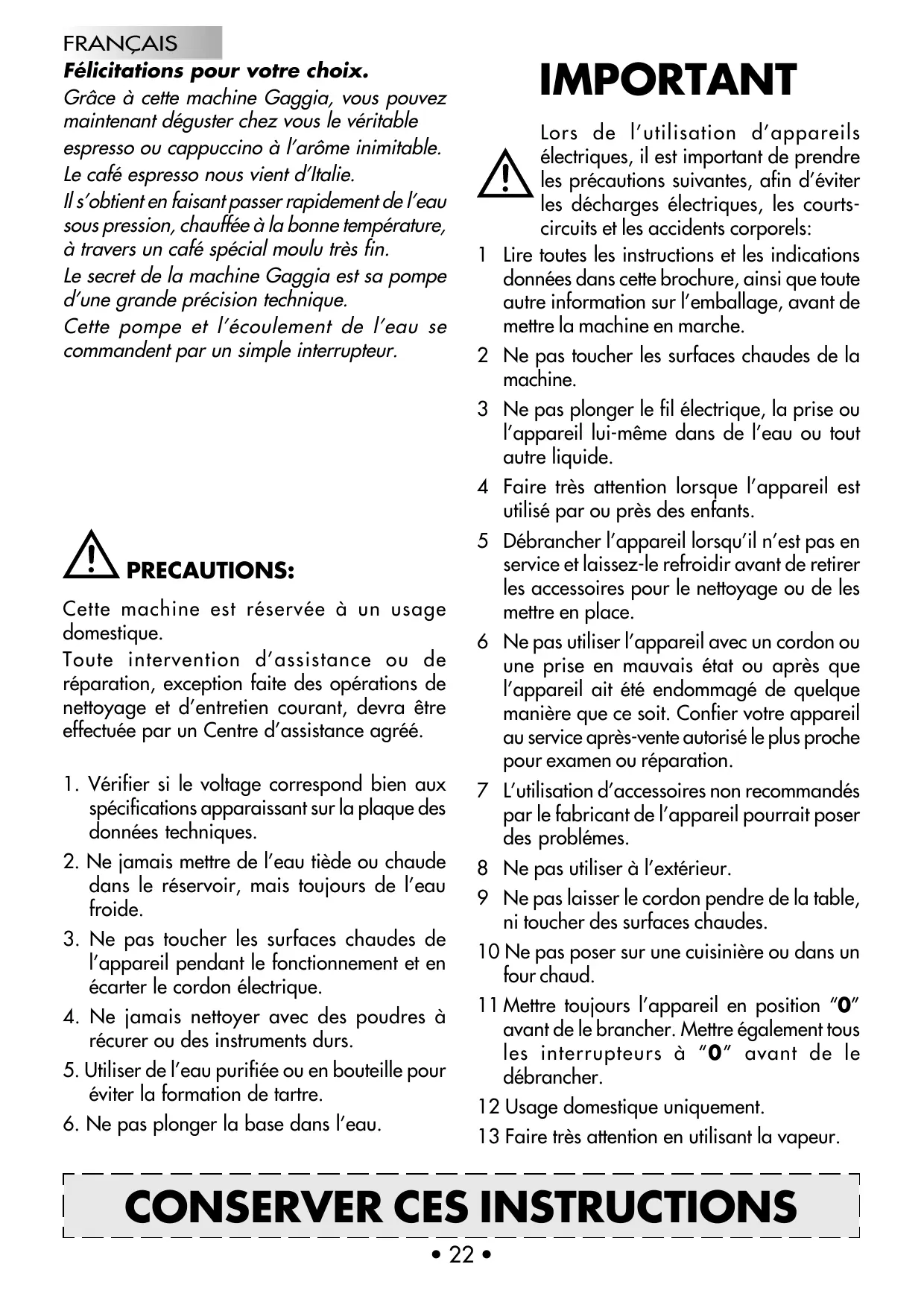FRANÇAIS Félicitations pour votre choix. Grâce à cette machine Gaggia, vous pouvez maintenant déguster chez vous le véritable espresso ou cappuccino à l’arôme inimitable. Le café espresso nous vient d’Italie. Il s’obtient en faisant passer rapidement de l’eau sous pression, chauffée à la bonne température, à travers un café spécial moulu très fin. Le secret de la machine Gaggia est sa pompe d’une grande précision technique. Cette pompe et l’écoulement de l’eau se commandent par un simple interrupteur.