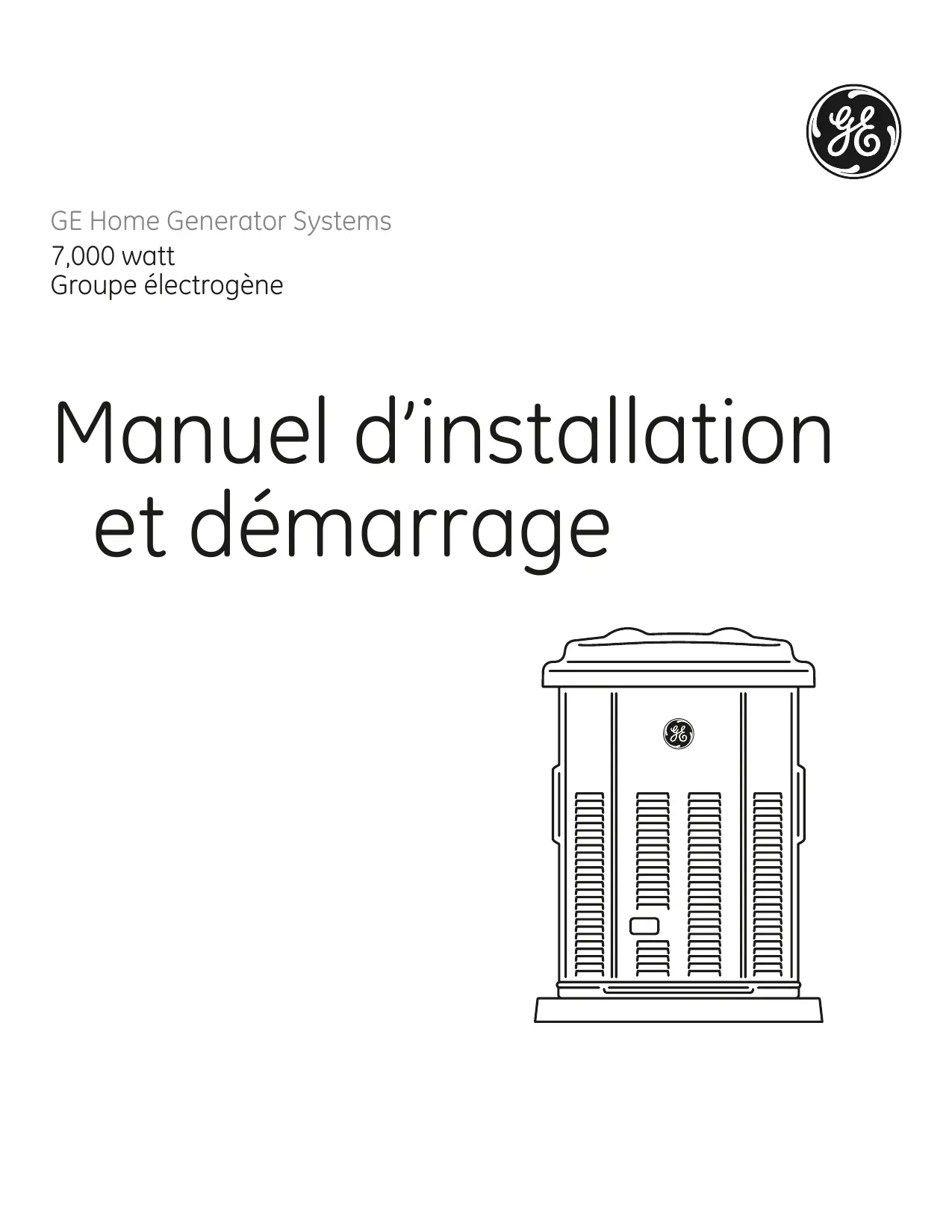 GE Home Generator Systems 7,000 watt Groupe électrogène Manuel d’installation et démarrage Nous vous remercions d’avoir acheté cette génératrice résidentielle de ualité GE. Nous sommes heureux ue vous fassiez confiance à la marue GE. Lorsue utilisée et entretenue selon les instructions de ce manuel, votre génératrice GE vous offrira de nombreuses années de service fiable. Ce manuel contient des renseignements sur la sécurité pour vous informer des dangers et des risques associés aux groupes électrogènes ainsi que de la façon de les éviter. Le groupe électrogène est conçu pour être utilisé comme génératrice résidentielle auxiliaire fournissant une source d’électricité alternative et pour desservir des charges comme le chauffage, les systèmes de réfrigération et les systèmes de communication qui, lorsqu’ils sont arrêtés durant une panne d’électricité, peuvent causer de l’inconfort ou des inconvénients. Conservez ces instructions pour référence future. Cette génératrice résidentielle auxiliaire exige une installation par un professionnel avant d’être utilisée. Votre installateur doit suivre ces directives à la lettre. Où nous trouver Vous n’aurez jamais à chercher bien loin pour trouver un centre de soutien et service pour votre génératrice. Consultez les Pages Jaunes. De nombreux distributeurs de service après-vente agréés GE offrent un service de qualité. Vous pouvez également communiquer avec le service à la clientèle en téléphonant sans frais au (888) 575‑8226 de 8 h à 17 h HNC. Pour la future référence Veuillez fournir les renseignements suivants et les conserver avec votre reçu pour vous aider dans l’identification de l’appareil lors de vos prochains achats d’équipement. Date d’achat Génératrice Numéro de modèle Révision Numéro de série Moteur Numéro de modèle
