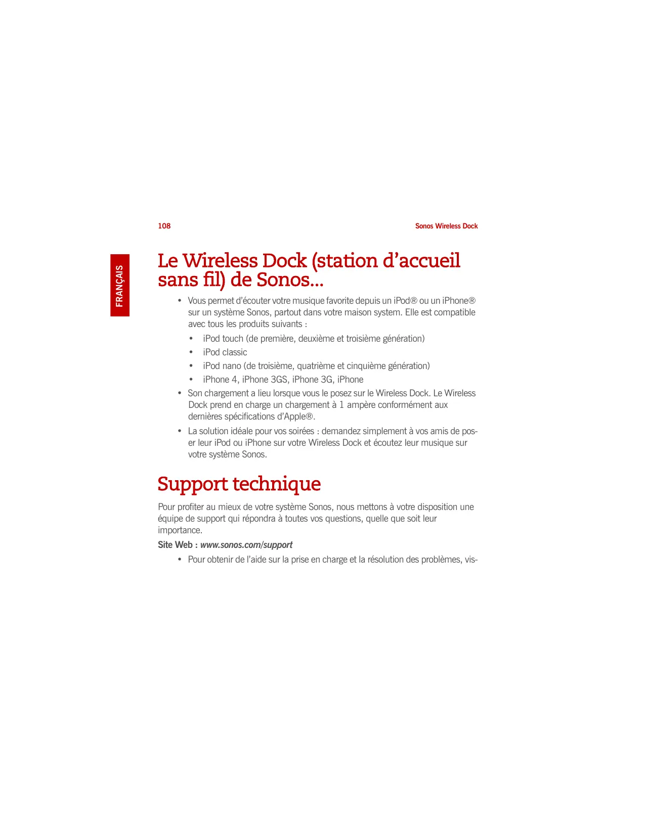 - La solution idéale pour vos soirées : demandez simplement à vos amis de poser leur iPod ou iPhone sur votre Wireless Dock et écoutez leur musique sur votre système Sonos. Support technique Pour profiter au mieux de votre système Sonos, nous mettons à votre disposition une équipe de support qui répondra à toutes vos questions, quelle que soit leur importance. Site Web : www.sonos.com/support