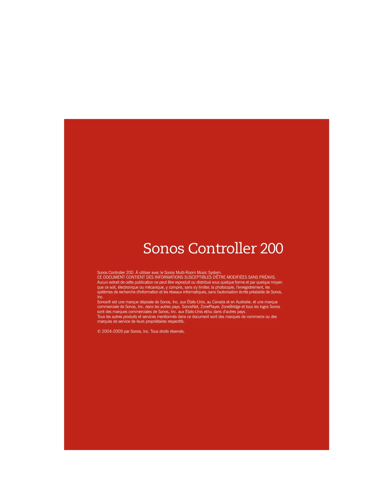 Sonos Controller 200 Sonos Controller 200. À utiliser avec le Sonos Multi-Room Music System. CE DOCUMENT CONTIENT DES INFORMATIONS SUSCEPTIBLES D'ÊTRE MODIFIÉES SANS PRÉAVIS. Aucun extrait de cette publication ne peut être reproduit ou distribué sous quelque forme et par quelque moyen que ce soit, électronique ou mécanique, y compris, sans s'y limiter, la photocopie, l’enregistrement, les systèmes de recherche d'information et les réseaux informatiques, sans l'autorisation écrite préalable de Sonos, Inc. Sonos® est une marque déposée de Sonos, Inc. aux États-Unis, au Canada et en Australie, et une marque commerciale de Sonos, Inc. dans les autres pays. SonosNet, ZonePlayer, ZoneBridge et tous les logos Sonos sont des marques commerciales de Sonos, Inc. aux États-Unis et/ou dans d’autres pays. Tous les autres produits et services mentionnés dans ce document sont des marques de commerce ou des marques de service de leurs propriétaires respectifs. © 2004-2009 par Sonos, Inc. Tous droits réservés. SVENSKA NEDERLANDS DEUTSCH FRANÇAIS