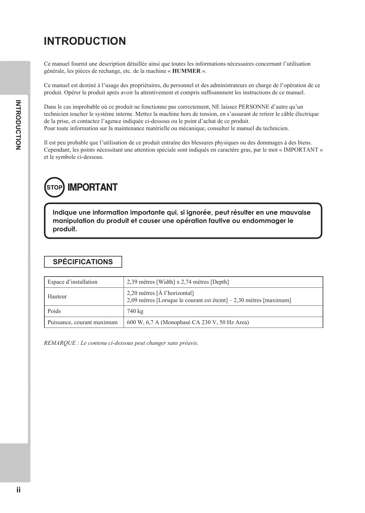 INTRODUCTION Ce manuel fournit une description détaillée ainsi que toutes les informations nécessaires concernant l’utilisation générale, les pièces de rechange, etc. de la machine « HUMMER ». Ce manuel est destiné à l’usage des propriétaires, du personnel et des administrateurs en charge de l’opération de ce produit. Opérer le produit après avoir lu attentivement et compris suffisamment les instructions de ce manuel. INTRODUCTION Dans le cas improbable où ce produit ne fonctionne pas correctement, NE laissez PERSONNE d’autre qu’un technicien toucher le système interne. Mettez la machine hors de tension, en s’assurant de retirer le câble électrique de la prise, et contactez l’agence indiquée ci-dessous ou le point d’achat de ce produit. Pour toute information sur la maintenance matérielle ou mécanique, consulter le manuel du technicien. Il est peu probable que l’utilisation de ce produit entraîne des blessures physiques ou des dommages à des biens. Cependant, les points nécessitant une attention spéciale sont indiqués en caractère gras, par le mot « IMPORTANT » et le symbole ci-dessous. Indique une information importante qui, si ignorée, peut résulter en une mauvaise manipulation du produit et causer une opération fautive ou endommager le produit. SPÉCIFICATIONS Espace d’installation 2,39 mètres [Width] x 2,74 mètres [Depth] Hauteur 2,20 mètres [À l’horizontal] 2,09 mètres [Lorsque le courant est éteint] – 2,30 mètres [maximum] Poids 740 kg Puissance, courant maximum 600 W, 6,7 A (Monophasé CA 230 V, 50 Hz Area) REMARQUE : Le contenu ci-dessous peut changer sans préavis.