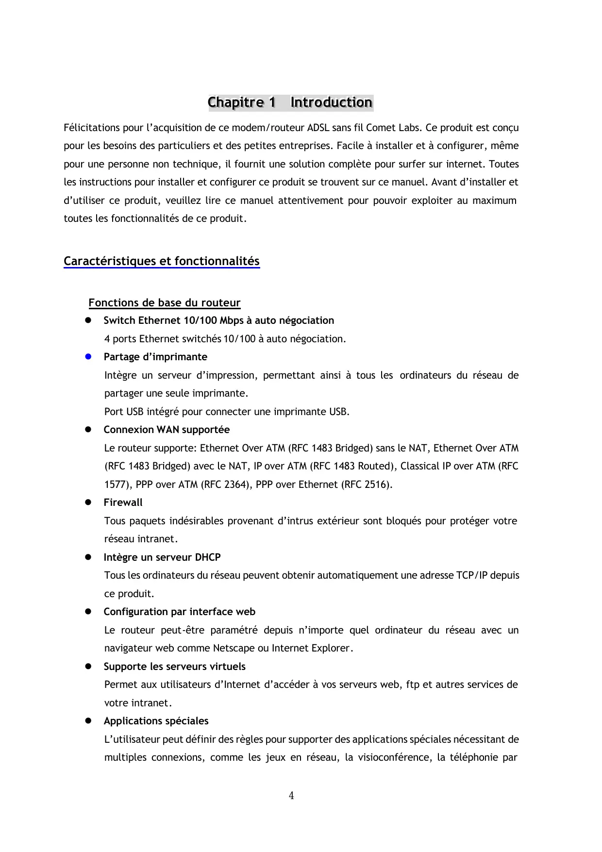CChhaappiittrree 11 IInnttrroodduuccttiioonn Félicitations pour l’acquisition de ce modem/routeur ADSL sans fil Comet Labs. Ce produit est conçu pour les besoins des particuliers et des petites entreprises. Facile à installer et à configurer, même pour une personne non technique, il fournit une solution complète pour surfer sur internet. Toutes les instructions pour installer et configurer ce produit se trouvent sur ce manuel. Avant d’installer et d’utiliser ce produit, veuillez lire ce manuel attentivement pour pouvoir exploiter au maximum toutes les fonctionnalités de ce produit. Caractéristiques et fonctionnalités Fonctions de base du routeur
