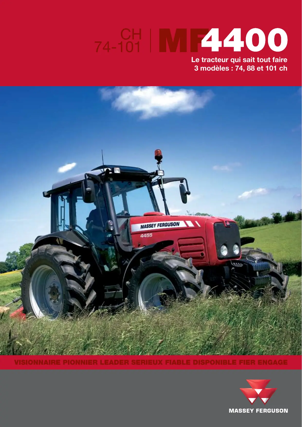 01 La série MF 4400 est une gamme de tracteurs robustes dont la mécanique simple permet d'allier durabilité et rentabilité. Facile d'utilisation, idéal pour les budgets réduits.