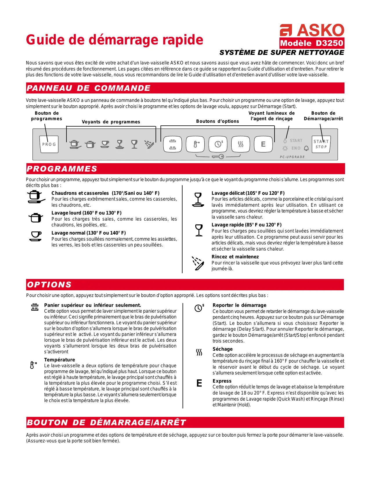 Nous savons que vous êtes excité de votre achat d'un lave-vaisselle ASKO etnous savons aussi que vous avez hâte de commencer. Voici donc un bref résumé des procédures de fonctionnement. Les pages citées en référence dans ce guide se rapportent au Guide d'utilisation et d'entretien. Pour retirer le plus des fonctions de votre lave-vaisselle, nous vous recommandons de lire le Guide d'utilisation et d'entretien avant d'utiliser votre lave-vaisselle.