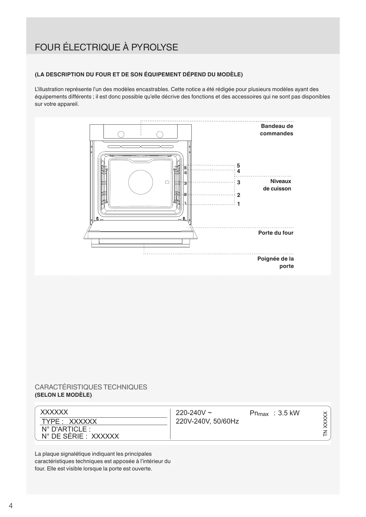 La plaque signalétique indiquant les principales caractéristiques techniques est apposée à l’intérieur du four. Elle est visible lorsque la porte est ouverte.