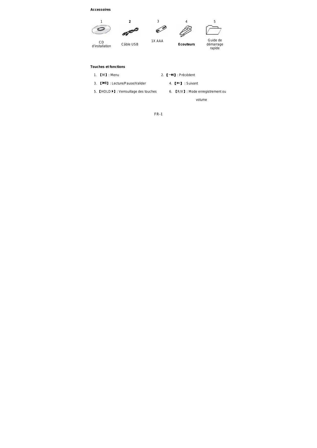 volume FR-1 Lecture de fichiers MP3 Pour démarrer : Branchez le connecteur des écouteurs dans un des deux connecteur jack du lecteur. Désactivez le verrouillage des touches à l’aide du commutateur 【HOLD 】. Appuyez longuement sur la touche【 】pour mettre le lecteur en marche. (Le mode par défaut est le mode « Musique ») Appuyez brièvement sur la touche【 】pour commencer la lecture. En mode musique, appuyez brièvement sur la touche 【M】 pour afficher le sous-menu et 】pour sélectionner l’option de votre choix : « Répétition », utilisez les touches【 】/【 « Egaliseur », « 3D », « Vitesse de lecture », « Intro », « Affichage », « A-B » ou « Explorateur de fichiers ». Appuyez brièvement sur la touche 【 】 pour confirmer. Pour revenir au menu principal : appuyez longuement sur la touche 【M】. Pour mettre la lecture en pause : appuyez brièvement sur la touche 【 】. Pour reprendre la lecture : appuyez de nouveau brièvement sur la touche 【 】. Pour changer de plage : utilisez les touches 【 】/【 Pour passer en mode enregistrement : appuyez longuement sur la touche 【R/V】 pour commencer l’enregistrement. Pour éteindre l’appareil : appuyez longuement sur la touche 【 】. Répétition : Sélectionnez l’option « Répétition » et appuyez brièvement sur la touche【 FR-2 】pour