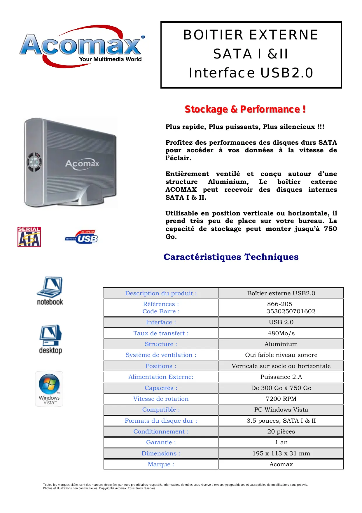 Entoipecation ventilé et conçu autour d'une structure Aluminium, Le boîtier externe ACOMAX peut recevoir des disques internes SATA I & II.