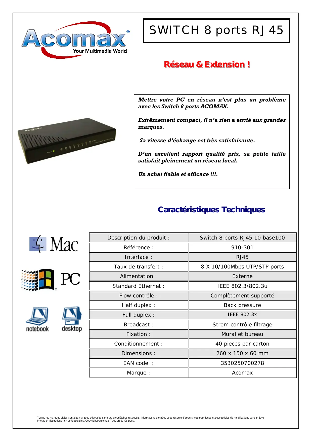 Exxtteennssiioonn !! Réésseeaauu & Mettre votre PC en réseau n’est plus un problème avec les Switch 8 ports ACOMAX. Extrêmement compact, il n’a rien a envié aux grandes marques. Sa vitesse d’échange est très satisfaisante. D’un excellent rapport qualité prix, sa petite taille satisfait pleinement un réseau local. Un achat fiable et efficace !!!. Caractéristiques Techniques