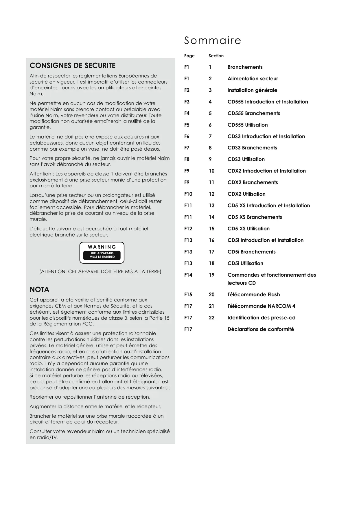 La conception des produits Naim Audio visse en premier lieu les performances. Une installation minutieuse est nécessaire pour assurer la réalisation de tout leur potentiel. Ce manuel couvre les lecteurs de CD suivants : CD 555, CDS3, CDX2, CD5 XS et CD5i, ainsi que leurs alimentations électriques associées ou de mise à niveau. Le manuel commence par des informations générales concernant l'installation et les averissements réglementaires sur la sécurité. Les informations spécifiques aux différents produits commencent en Section 4.