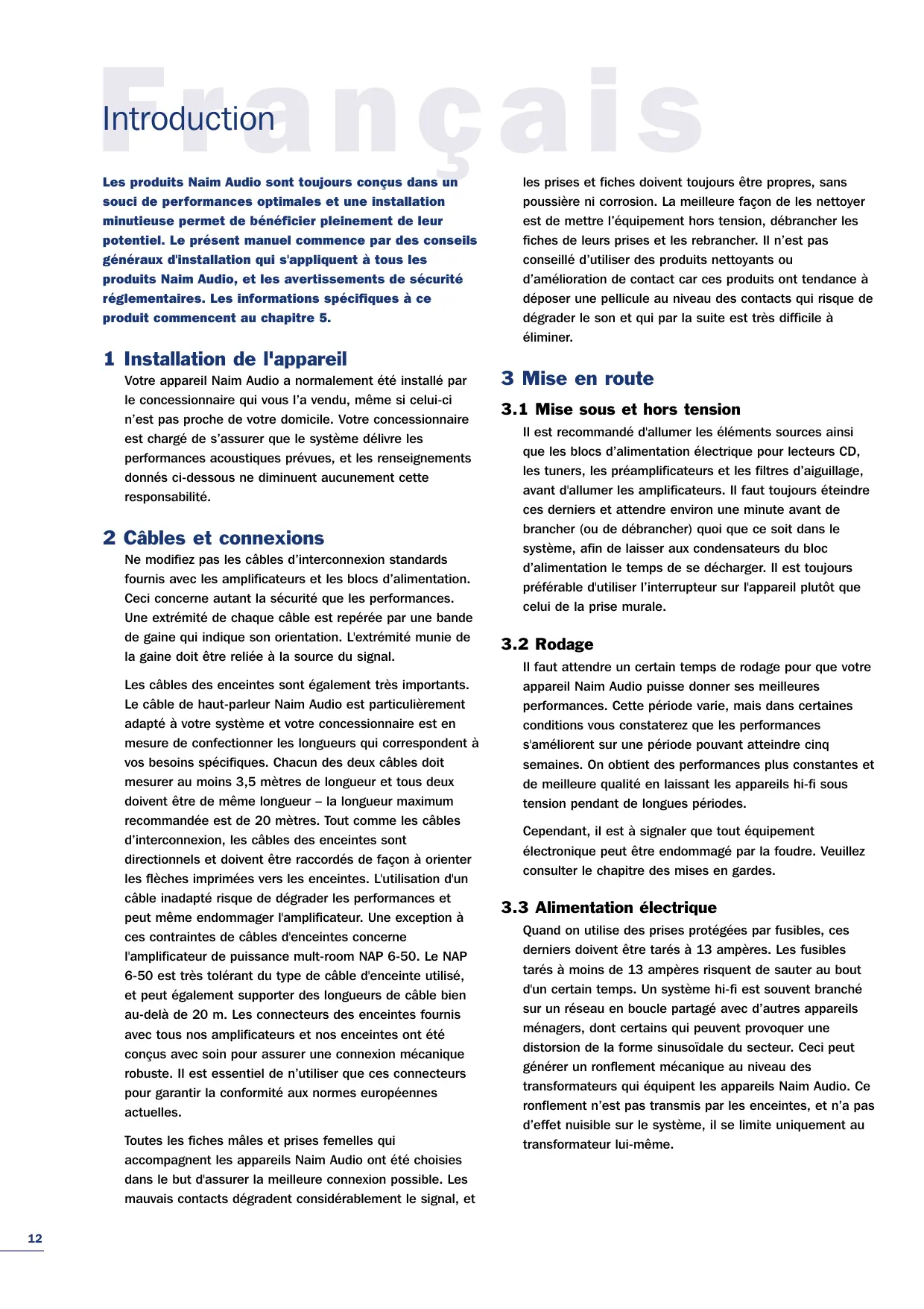 Français Introduction Les produits Naim Audio sont toujours conçus dans un souci de performances optimales et une installation minutieuse permet de bénéficier pleinement de leur potentiel. Le présent manuel commence par des conseils généraux d'installation qui s'appliquent à tous les produits Naim Audio, et les avertissements de sécurité réglementaires. Les informations spécifiques à ce produit commencent au chapitre 5. les prises et fiches doivent toujours être propres, sans poussière ni corrosion. La meilleure façon de les nettoyer est de mettre l’équipement hors tension, débrancher les fiches de leurs prises et les rebrancher. Il n’est pas conseillé d’utiliser des produits nettoyants ou d’amélioration de contact car ces produits ont tendance à déposer une pellicule au niveau des contacts qui risque de dégrader le son et qui par la suite est très difficile à éliminer. 1 Installation de l'appareil Votre appareil Naim Audio a normalement été installé par le concessionnaire qui vous l’a vendu, même si celui-ci n’est pas proche de votre domicile. Votre concessionnaire est chargé de s’assurer que le système délivre les performances acoustiques prévues, et les renseignements donnés ci-dessous ne diminuent aucunement cette responsabilité. 2 Câbles et connexions Ne modifiez pas les câbles d’interconnexion standards fournis avec les amplificateurs et les blocs d’alimentation. Ceci concerne autant la sécurité que les performances. Une extrémité de chaque câble est repérée par une bande de gaine qui indique son orientation. L'extrémité munie de la gaine doit être reliée à la source du signal. Les câbles des enceintes sont également très importants. Le câble de haut-parleur Naim Audio est particulièrement adapté à votre système et votre concessionnaire est en mesure de confectionner les longueurs qui correspondent à vos besoins spécifiques. Chacun des deux câbles doit mesurer au moins 3,5 mètres de longueur et tous deux doivent être de même longueur – la longueur maximum recommandée est de 20 mètres. Tout comme les câbles d’interconnexion, les câbles des enceintes sont directionnels et doivent être raccordés de façon à orienter les flèches imprimées vers les enceintes. L'utilisation d'un câble inadapté risque de dégrader les performances et peut même endommager l'amplificateur. Une exception à ces contraintes de câbles d'enceintes concerne l'amplificateur de puissance mult-room NAP 6-50. Le NAP 6-50 est très tolérant du type de câble d'enceinte utilisé, et peut également supporter des longueurs de câble bien au-delà de 20 m. Les connecteurs des enceintes fournis avec tous nos amplificateurs et nos enceintes ont été conçus avec soin pour assurer une connexion mécanique robuste. Il est essentiel de n’utiliser que ces connecteurs pour garantir la conformité aux normes européennes actuelles. Toutes les fiches mâles et prises femelles qui accompagnent les appareils Naim Audio ont été choisies dans le but d'assurer la meilleure connexion possible. Les mauvais contacts dégradent considérablement le signal, et