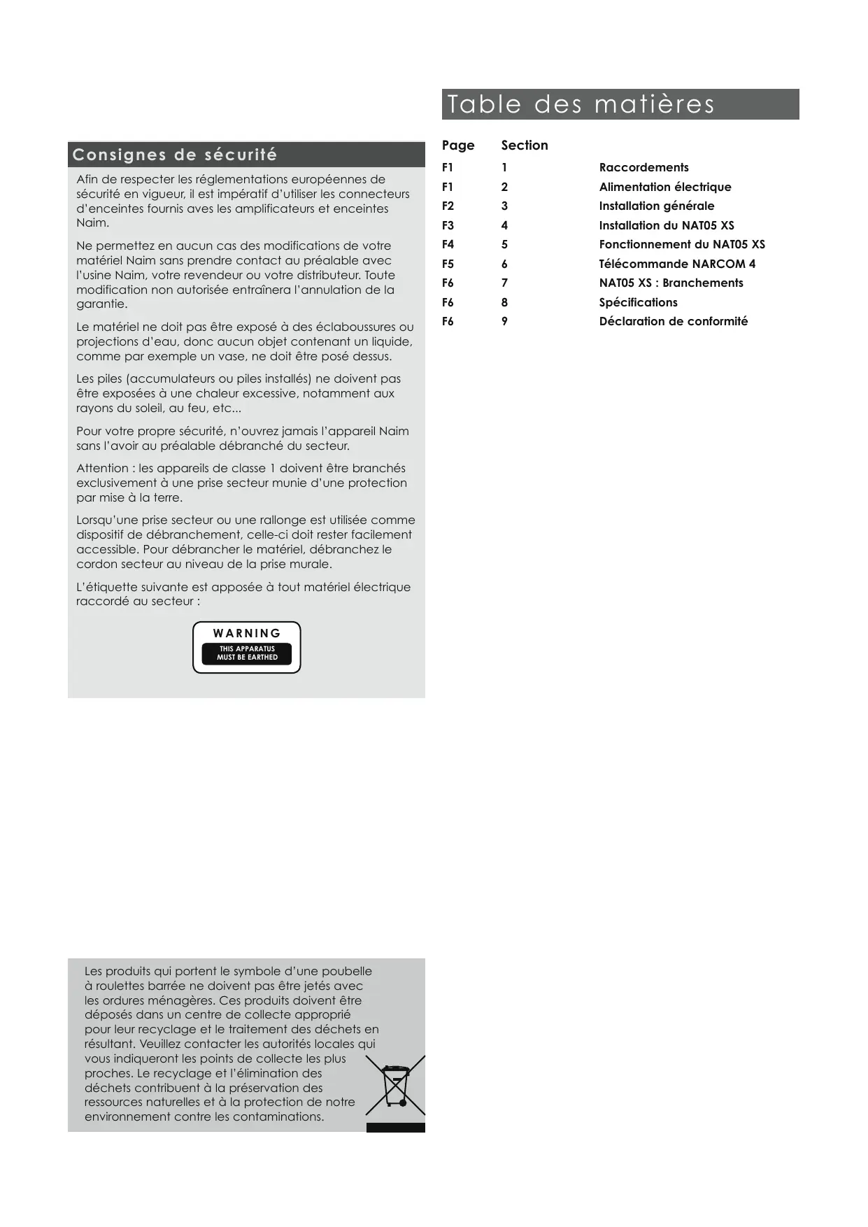 able des matières Page Section F1 1 Raccordements F1 2 Alimentation électrique F2 3 Installation générale F3 4 Installation du NATO5 XS F4 5 Fonctionnement du NATO5 XS F5 6 Télécommande NARCOM 4 F6 7 NATOS XS : Branchements F6 8 Spécifications F6 9 Déclaration de conformité
