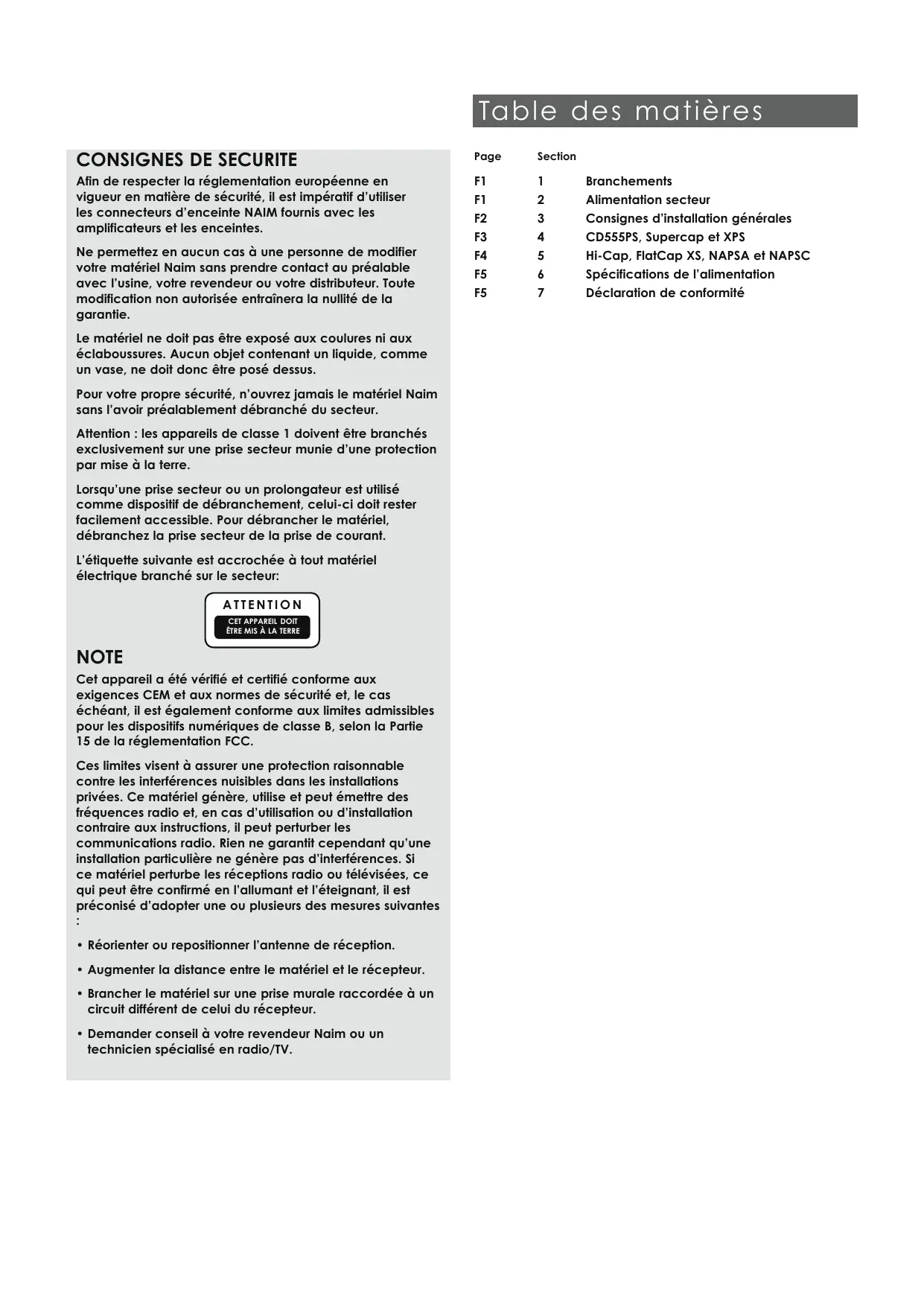 Le matériel ne doit pas être exposé aux coulures ni aux éclaboussures. Aucun objet contenant un liquide, comme un vase, ne doit donc être posé dessus. Pour votre propre sécurité, n’ouvrez jamais le matériel Naim sans l’avoir préalablement débranché du secteur. Attention : les appareils de classe 1 doivent être branchés exclusivement sur une prise secteur munie d’une protection par mise à la terre. Lorsqu’une prise secteur ou un prolongateur est utilisé comme dispositif de débranchement, celui-ci doit rester facilement accessible. Pour débrancher le matériel, débranchez la prise secteur de la prise de courant. L’étiquette suivante est accrochée à tout matériel électrique branché sur le secteur: a tt e n ti o n Cet appareil doit être mis à la terre NOTE Cet appareil a été vérifié et certifié conforme aux exigences CEM et aux normes de sécurité et, le cas échéant, il est également conforme aux limites admissibles pour les dispositifs numériques de classe B, selon la Partie 15 de la réglementation FCC. Ces limites visent à assurer une protection raisonnable contre les interférences nuisibles dans les installations privées. Ce matériel génère, utilise et peut émettre des fréquences radio et, en cas d’utilisation ou d’installation contraire aux instructions, il peut perturber les communications radio. Rien ne garantit cependant qu’une installation particulière ne génère pas d’interférences. Si ce matériel perturbe les réceptions radio ou télévisées, ce qui peut être confirmé en l’allumant et l’éteignant, il est préconisé d’adopter une ou plusieurs des mesures suivantes