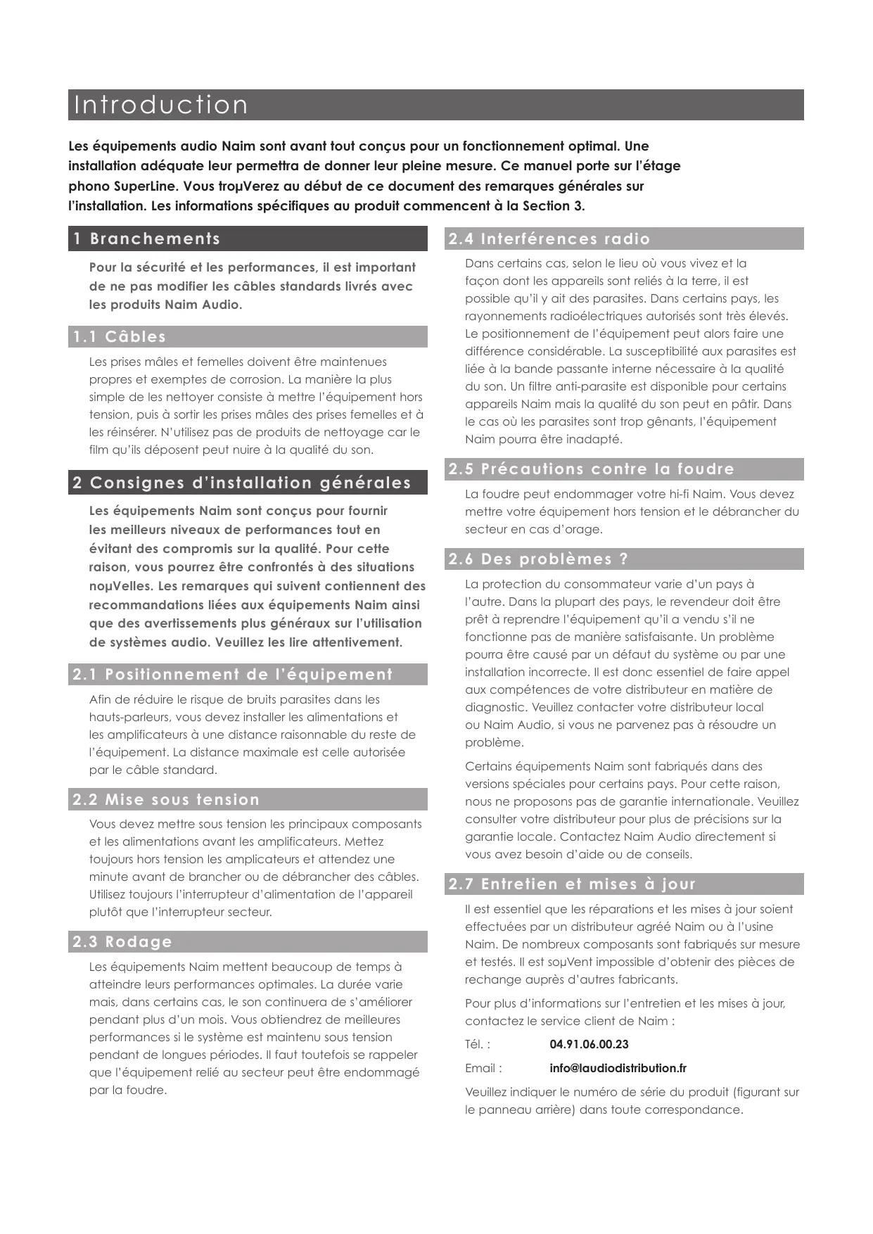 Les équipements Naim mettent beaucoup de temps à atteindre leurs performances optimales. La durée varie mais, dans certains cas, le son continuera de s’améliorer pendant plus d’un mois. Vous obtiendrez de meilleures performances si le système est maintenu sous tension pendant de longues périodes. Il faut toutefois se rappeler que l’équipement relié au secteur peut être endommagé par la foudre. 2 . 4 I n t er f ér en ces r a d i o Dans certains cas, selon le lieu où vous vivez et la façon dont les appareils sont reliés à la terre, il est possible qu’il y ait des parasites. Dans certains pays, les rayonnements radioélectriques autorisés sont très élevés. Le positionnement de l’équipement peut alors faire une différence considérable. La susceptibilité aux parasites est liée à la bande passante interne nécessaire à la qualité du son. Un filtre anti-parasite est disponible pour certains appareils Naim mais la qualité du son peut en pâtir. Dans le cas où les parasites sont trop gênants, l’équipement Naim pourra être inadapté. 2 . 5 P r éca u t i on s con t r e l a f ou d r e La foudre peut endommager votre hi-fi Naim. Vous devez mettre votre équipement hors tension et le débrancher du secteur en cas d’orage. 2 . 6 Des p r ob l èm es ? La protection du consommateur varie d’un pays à l’autre. Dans la plupart des pays, le revendeur doit être prêt à reprendre l’équipement qu’il a vendu s’il ne fonctionne pas de manière satisfaisante. Un problème pourra être causé par un défaut du système ou par une installation incorrecte. Il est donc essentiel de faire appel aux compétences de votre distributeur en matière de diagnostic. Veuillez contacter votre distributeur local ou Naim Audio, si vous ne parvenez pas à résoudre un problème. Certains équipements Naim sont fabriqués dans des versions spéciales pour certains pays. Pour cette raison, nous ne proposons pas de garantie internationale. Veuillez consulter votre distributeur pour plus de précisions sur la garantie locale. Contactez Naim Audio directement si vous avez besoin d’aide ou de conseils. 2 . 7 E n t r et i en et m i s es à jou r Il est essentiel que les réparations et les mises à jour soient effectuées par un distributeur agréé Naim ou à l’usine Naim. De nombreux composants sont fabriqués sur mesure et testés. Il est soµVent impossible d’obtenir des pièces de rechange auprès d’autres fabricants. Pour plus d’informations sur l’entretien et les mises à jour, contactez le service client de Naim : Tél. :
