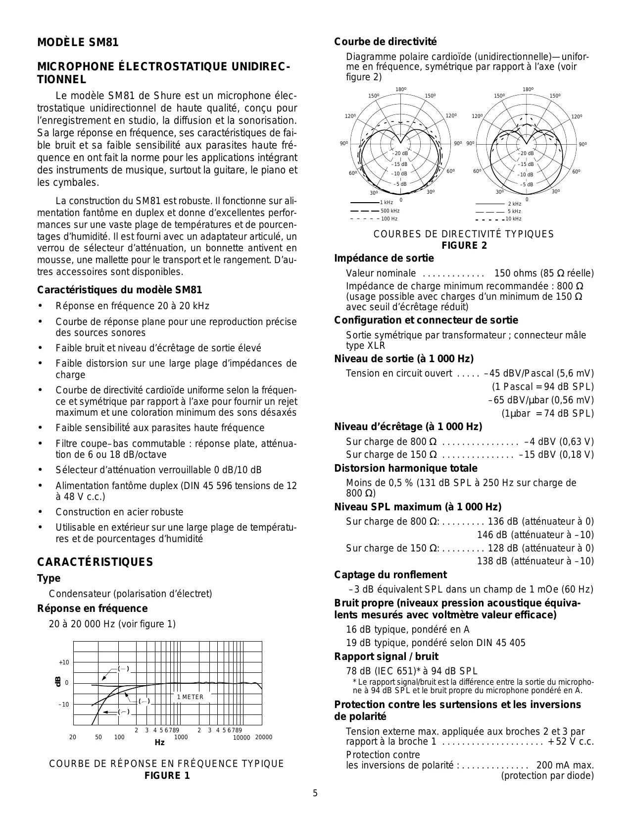 Diagramme polaire cardioïde (unidirectionnelle)—uniforme en fréquence, symétrique par rapport à l’axe (voir figure 2) Le modèle SM81 de Shure est un microphone électrostatique unidirectionnel de haute qualité, conçu pour l’enregistrement en studio, la diffusion et la sonorisation. Sa large réponse en fréquence, ses caractéristiques de faible bruit et sa faible sensibilité aux parasites haute fréquence en ont fait la norme pour les applications intégrant des instruments de musique, surtout la guitare, le piano et les cymbales. 150o 120o 120o 90o Faible bruit et niveau d’écrêtage de sortie élevé