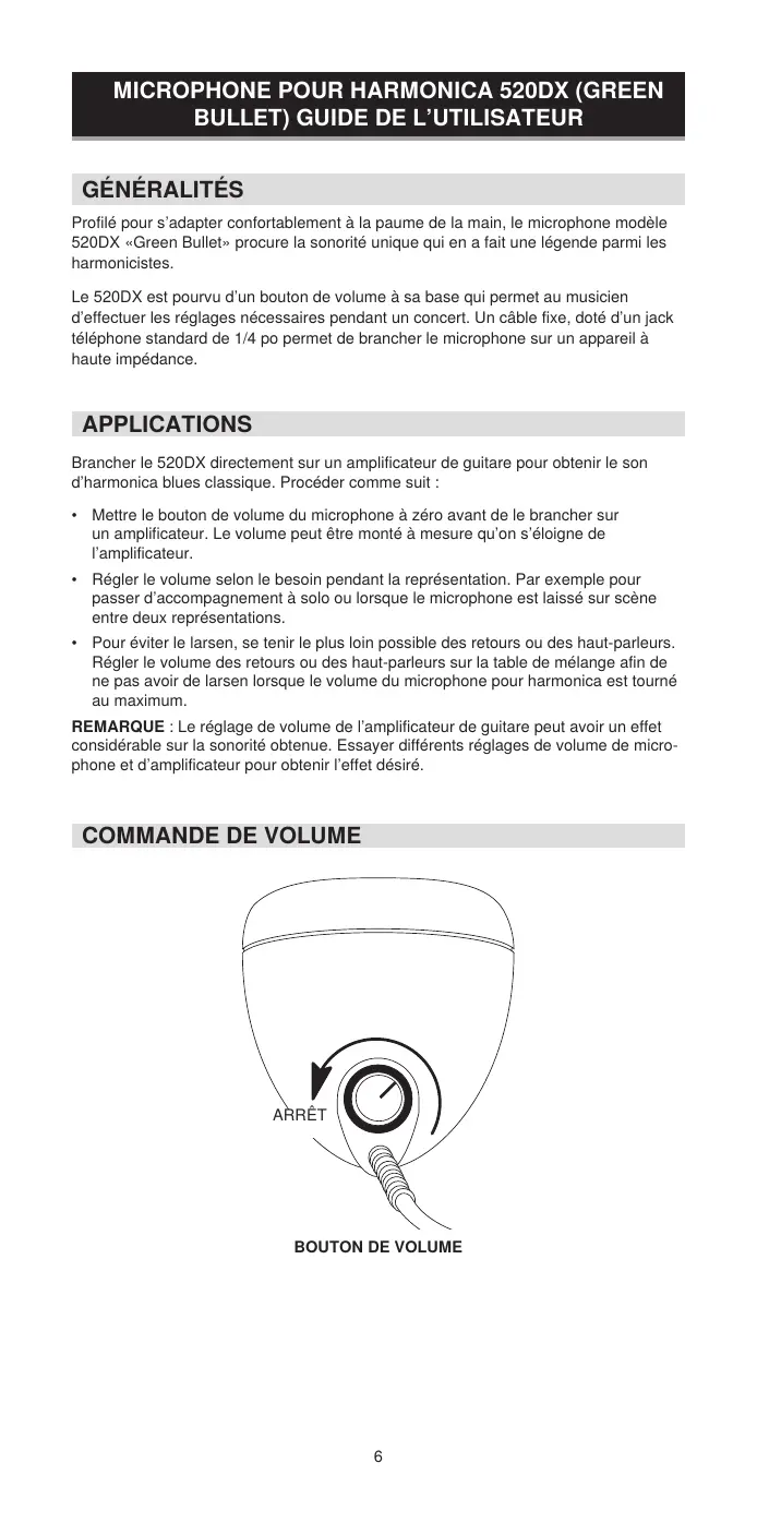 Profilé pour s’adapter confortablement à la paume de la main, le microphone modèle 520DX «Green Bullet» procure la sonorité unique qui en a fait une légende parmi les harmonicistes. Le 520DX est pourvu d’un bouton de volume à sa base qui permet au musicien d’effectuer les réglages nécessaires pendant un concert. Un câble fixe, doté d’un jack téléphone standard de 1/4 po permet de brancher le microphone sur un appareil à haute impédance. APPLICATIONS Brancher le 520DX directement sur un amplificateur de guitare pour obtenir le son d’harmonica blues classique. Procéder comme suit :