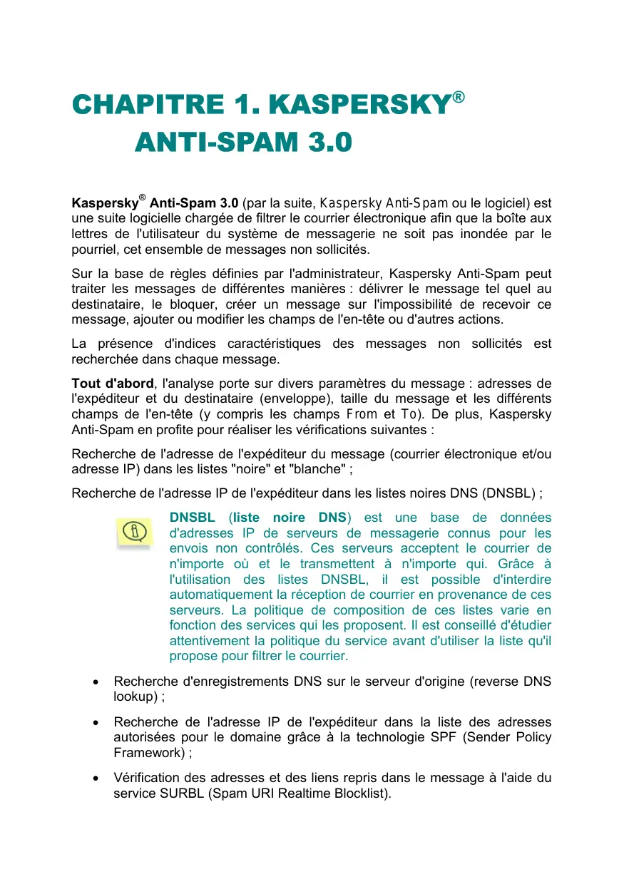 Retrouvez gratuitement la notice de l'appareil ANTI-SPAM 3.0 KASPERSKY au format PDF.