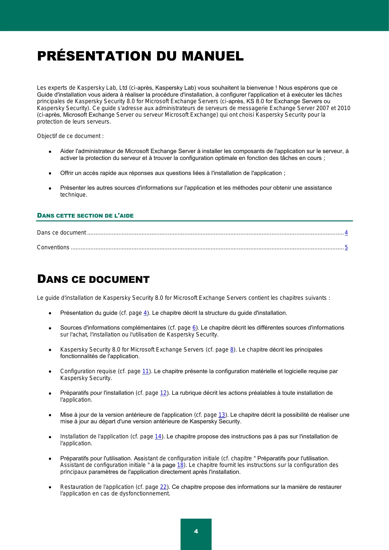 Le guide d'installation de Kaspersky Security 8.0 for Microsoft Exchange Servers contient les chapitres suivants : + Présentation du guide (cf. page 4). Le chapitre décrit la structure du guide d'installation. e__ Sources d'informations complémentaires (cf. page 6). Le chapitre décrit les différentes sources d'informations sur l'achat, l'installation ou l'utilisation de Kaspersky Security. + Kaspersky Security 8.0 for Microsoft Exchange Servers (cf. page 8). Le chapitre décrit les principales fonctionnalités de l'application. e+ __ Configuration requise (cf. page 11). Le chapitre présente la configuration matérielle et logicielle requise par Kaspersky Security. °__ Préparatifs pour l'installation (cf. page 12). La rubrique décrit les actions préalables à toute installation de l'application. + Mise à jour de la version antérieure de l'application (cf. page 13). Le chapitre décrit la possibilité de réaliser une mise à jour au départ d'une version antérieure de Kaspersky Security. < Installation de l'application (cf. page 14). Le chapitre propose des instructions pas à pas sur l'installation de l'application. °+ Préparatifs pour l'utilisation. Assistant de configuration initiale (cf. chapitre " Préparatifs pour l'utilisation. Assistant de configuration initiale " à la page 18). Le chapitre fournit les instructions sur la configuration des principaux paramètres de l'application directement après l'installation. ° Restauration de l'application (cf. page 22). Ce chapitre propose des informations sur la manière de restaurer l'application en cas de dysfonctionnement.