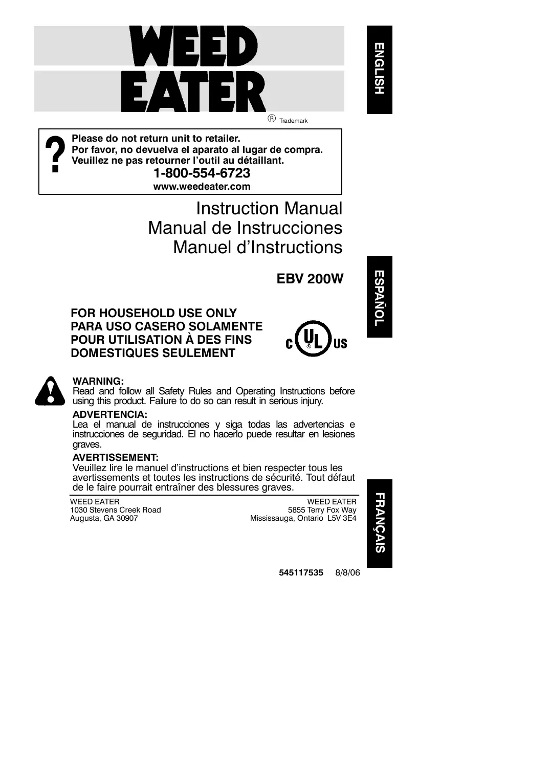 Retrouvez gratuitement la notice de l'appareil EBV200W WEED EATER au format PDF.
