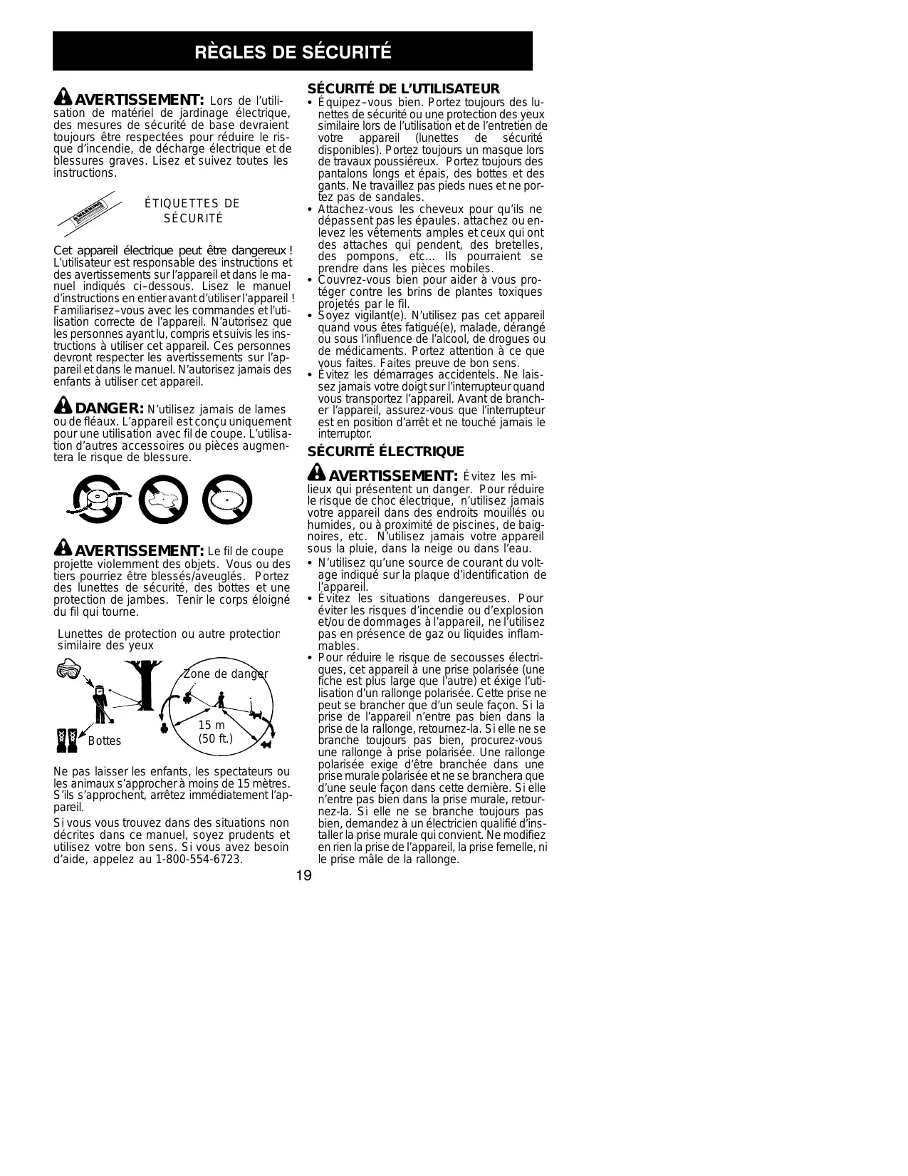 projette violemment des objets. Vous ou des tiers pourriez être blessés/aveuglés. Portez des lunettes de sécurité, des bottes et une protection de jambes. Tenir le corps éloigné du fil qui tourne. Lunettes de protection ou autre protection similaire des yeux Zone de danger Bottes 15 m (50 ft.) Ne pas laisser les enfants, les spectateurs ou les animaux s’approcher à moins de 15 mètres. S’ils s’approchent, arrêtez immédiatement l’appareil. Si vous vous trouvez dans des situations non décrites dans ce manuel, soyez prudents et utilisez votre bon sens. Si vous avez besoin d’aide, appelez au 1-800-554-6723.