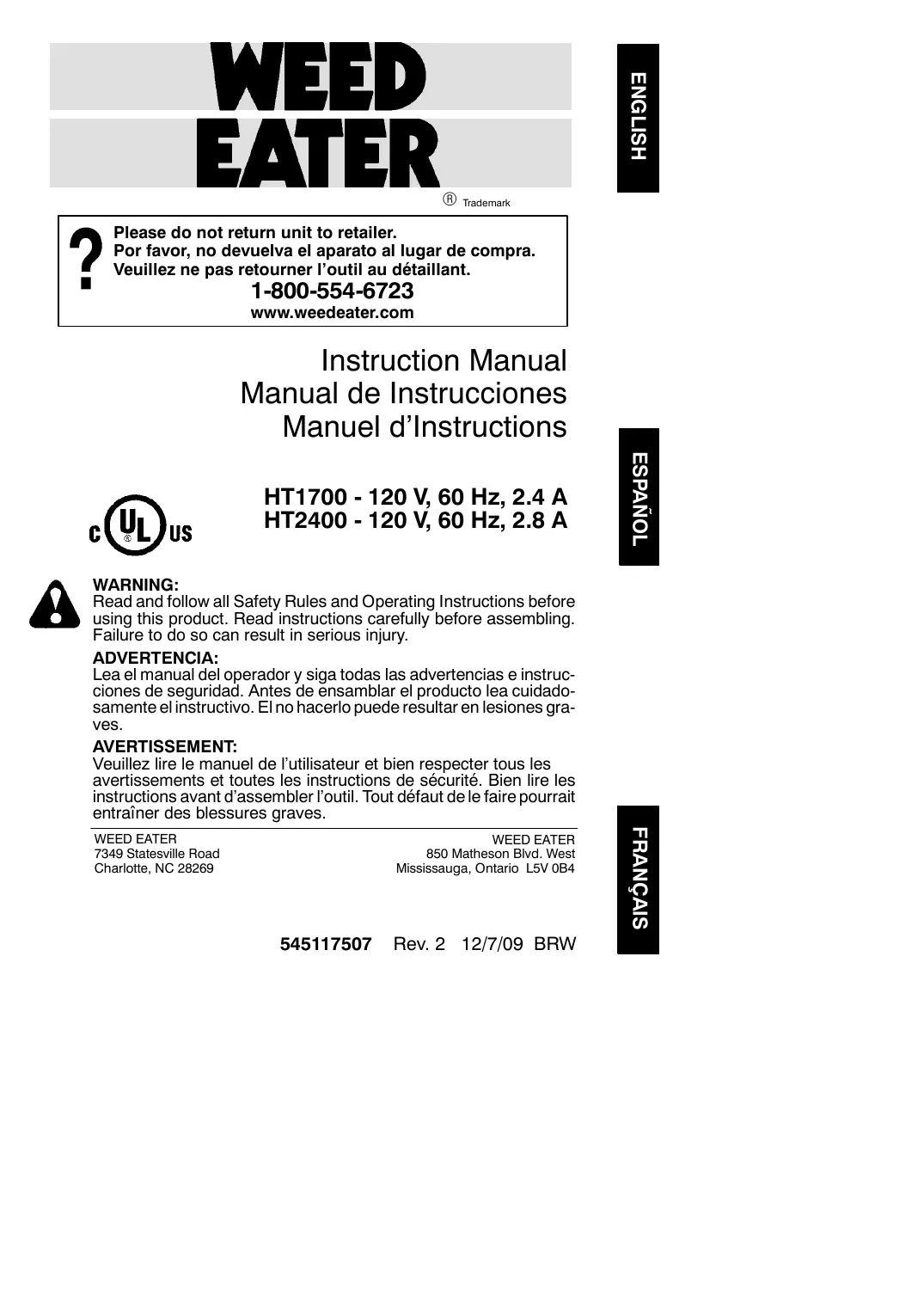 Retrouvez gratuitement la notice de l'appareil 2400 WEED EATER au format PDF.