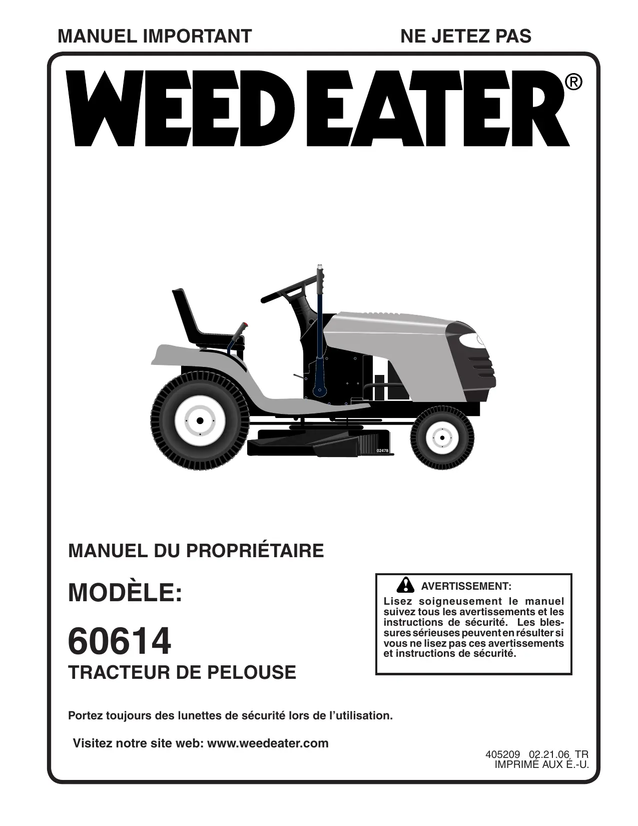 Portez toujours des lunettes de sécurité lors de l’utilisation. Visitez notre site web: www.weedeater.com 405209 02.21.06 TR IMPRIMÉ AUX É.-U.