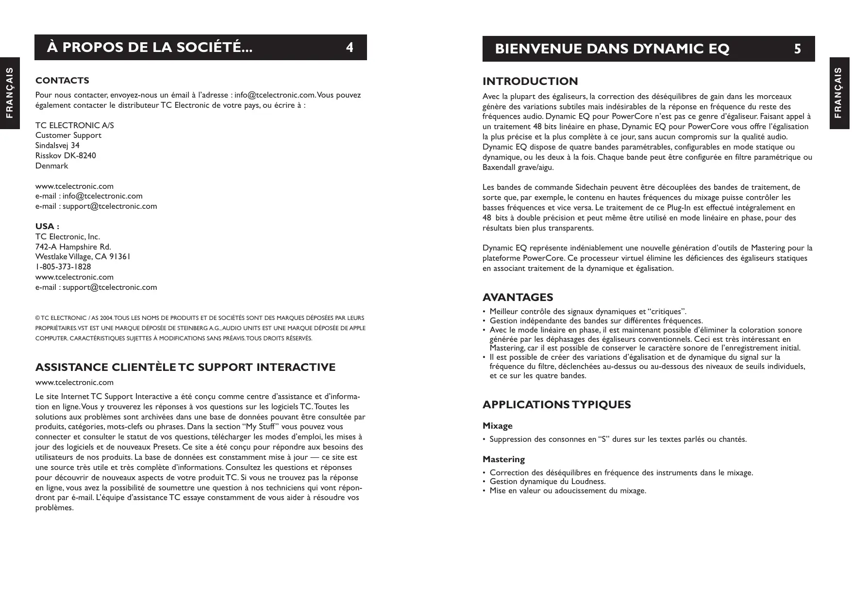 CONTACTS INTRODUCTION Pour nous contacter, envoyez-nous un émail à l’adresse : info@tcelectronic.com.Vous pouvez également contacter le distributeur TC Electronic de votre pays, ou écrire à : Avec la plupart des égaliseurs, la correction des déséquilibres de gain dans les morceaux génère des variations subtiles mais indésirables de la réponse en fréquence du reste des fréquences audio. Dynamic EQ pour PowerCore n’est pas ce genre d’égaliseur. Faisant appel à un traitement 48 bits linéaire en phase, Dynamic EQ pour PowerCore vous offre l’égalisation la plus précise et la plus complète à ce jour, sans aucun compromis sur la qualité audio. Dynamic EQ dispose de quatre bandes paramétrables, configurables en mode statique ou dynamique, ou les deux à la fois. Chaque bande peut être configurée en filtre paramétrique ou Baxendall grave/aigu.