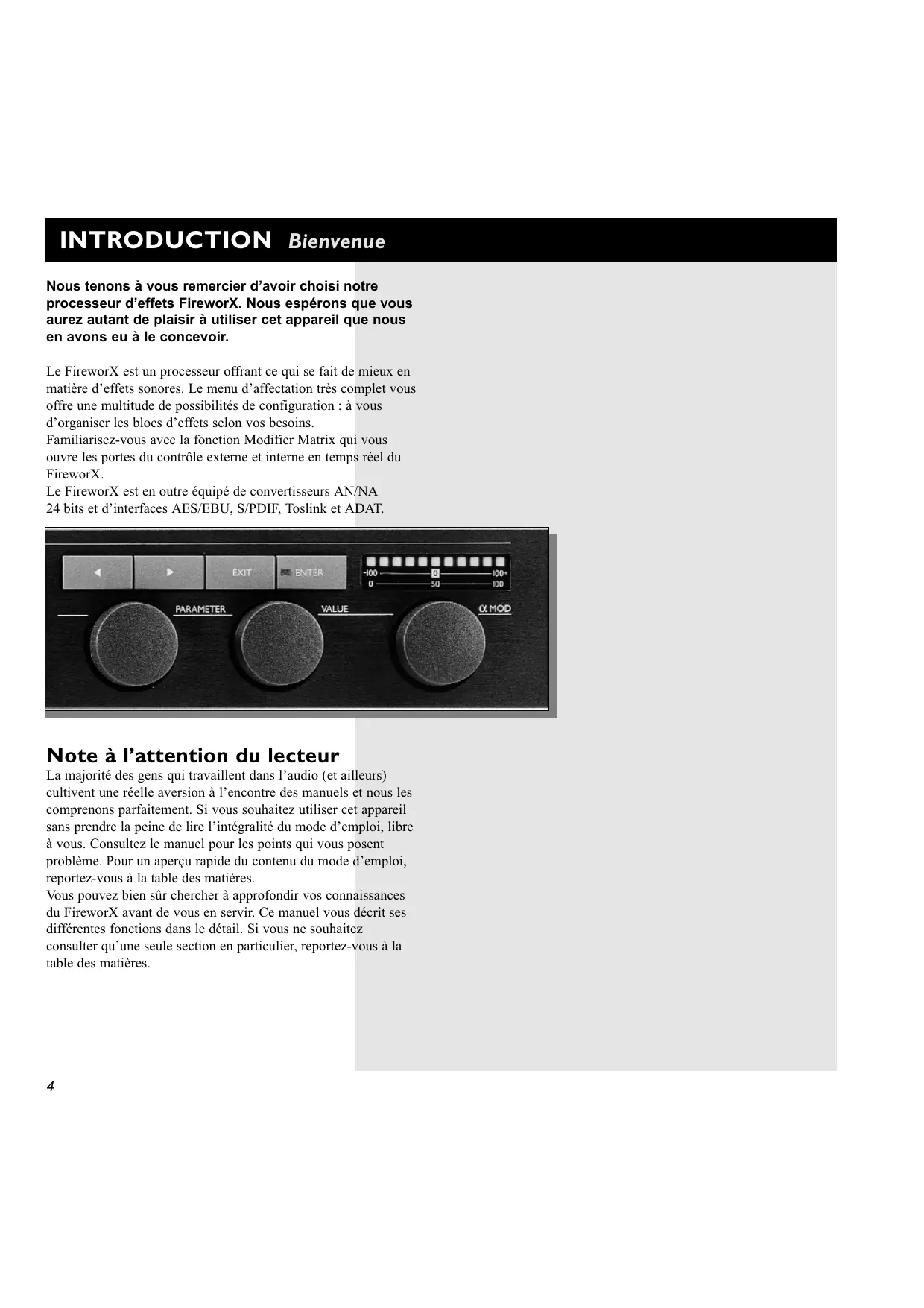 INTRODUCTION Bienvenue Nous tenons à vous remercier davoir choisi notre processeur deffets FireworX. Nous espérons que vous aurez autant de plaisir à utiliser cet appareil que nous en avons eu à le concevoir. Le FireworX est un processeur offrant ce qui se fait de mieux en matière deffets sonores. Le menu daffectation très complet vous offre une multitude de possibilités de configuration : à vous dorganiser les blocs deffets selon vos besoins. Familiarisez-vous avec la fonction Modifier Matrix qui vous ouvre les portes du contrôle externe et interne en temps réel du FireworX. Le FireworX est en outre équipé de convertisseurs AN/NA 24 bits et dinterfaces AES/EBU, S/PDIF, Toslink et ADAT. Note à lattention du lecteur La majorité des gens qui travaillent dans laudio (et ailleurs) cultivent une réelle aversion à lencontre des manuels et nous les comprenons parfaitement. Si vous souhaitez utiliser cet appareil sans prendre la peine de lire lintégralité du mode demploi, libre à vous. Consultez le manuel pour les points qui vous posent problème. Pour un aperçu rapide du contenu du mode demploi, reportez-vous à la table des matières. Vous pouvez bien sûr chercher à approfondir vos connaissances du FireworX avant de vous en servir. Ce manuel vous décrit ses différentes fonctions dans le détail. Si vous ne souhaitez consulter quune seule section en particulier, reportez-vous à la table des matières.