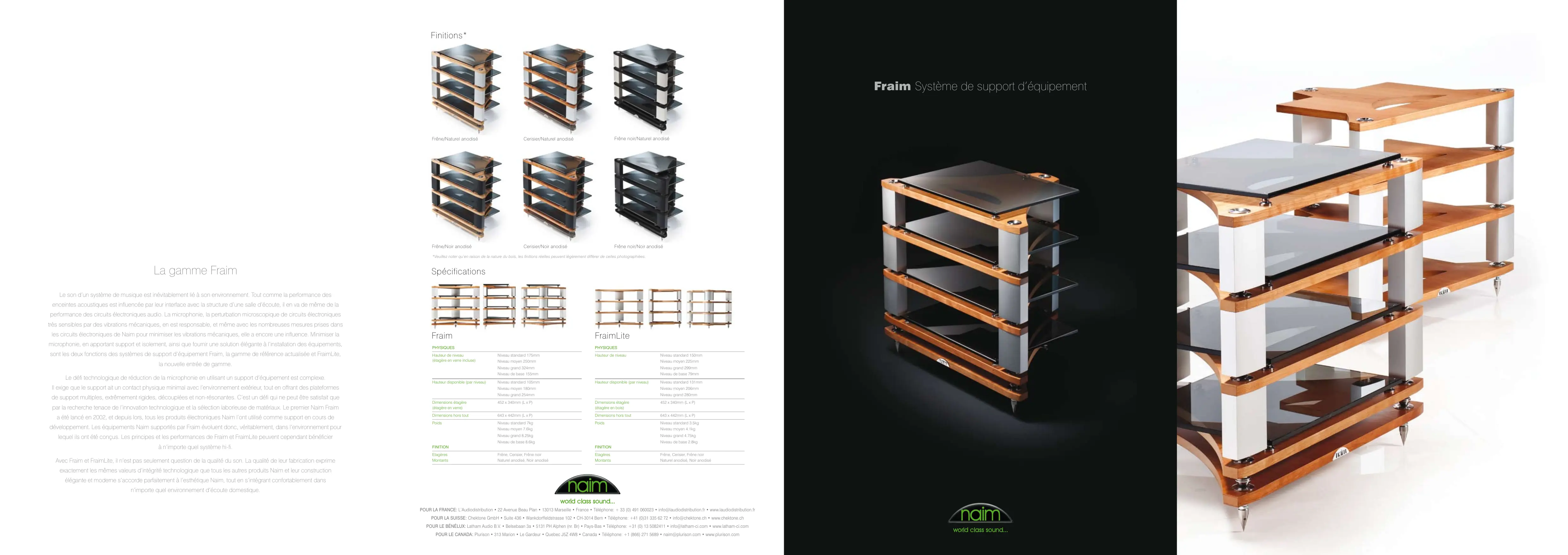 Le choix des matériaux de Fraim est aussi important que l'arrangement de ses composants. Aoier super dur inoxydable, verre tempé sélectionné à la suite de tests d'écoute intensifs, extrusion en aluminium anodisé à section totale et composites en bois plaquè contribuant à produit un support d'équipment à la performance parfaite et qui compte parfaitement l'esthétique Naim.