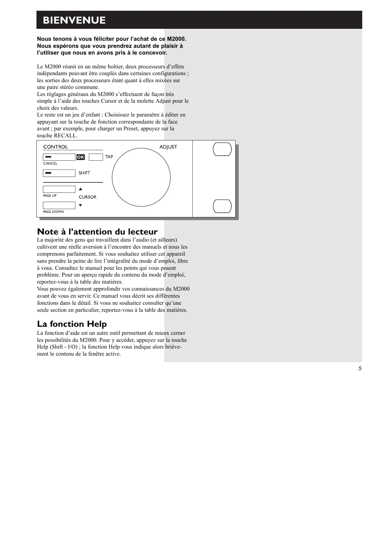 BIENVENUE Nous tenons à vous féliciter pour l’achat de ce M2000. Nous espérons que vous prendrez autant de plaisir à l’utiliser que nous en avons pris à le concevoir. Le M2000 réunit en un même boîtier, deux processeurs d’effets indépendants pouvant être couplés dans certaines configurations ; les sorties des deux processeurs étant quant à elles mixées sur une paire stéréo commune. Les réglages généraux du M2000 s’effectuent de façon très simple à l’aide des touches Cursor et de la molette Adjust pour le choix des valeurs. Le reste est un jeu d’enfant : Choisissez le paramètre à éditer en appuyant sur la touche de fonction correspondante de la face avant ; par exemple, pour charger un Preset, appuyez sur la touche RECALL. Note à l’attention du lecteur La majorité des gens qui travaillent dans l’audio (et ailleurs) cultivent une réelle aversion à l’encontre des manuels et nous les comprenons parfaitement. Si vous souhaitez utiliser cet appareil sans prendre la peine de lire l’intégralité du mode d’emploi, libre à vous. Consultez le manuel pour les points qui vous posent problème. Pour un aperçu rapide du contenu du mode d’emploi, reportez-vous à la table des matières. Vous pouvez également approfondir vos connaissances du M2000 avant de vous en servir. Ce manuel vous décrit ses différentes fonctions dans le détail. Si vous ne souhaitez consulter qu’une seule section en particulier, reportez-vous à la table des matières. La fonction Help La fonction d’aide est un autre outil permettant de mieux cerner les possibilités du M2000. Pour y accéder, appuyez sur la touche Help (Shift - I/O) ; la fonction Help vous indique alors briévement le contenu de la fenêtre active.