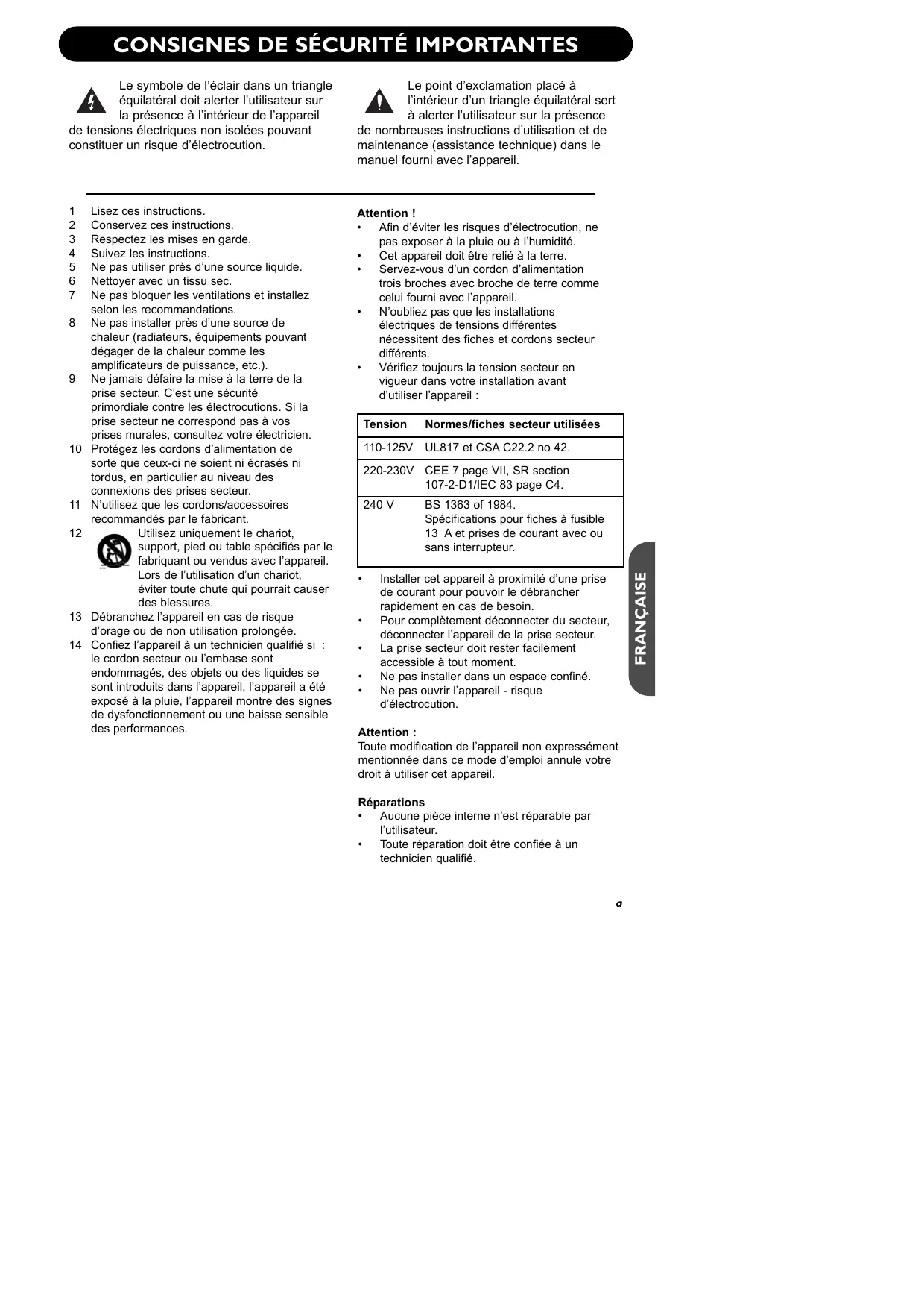 - Vérifiez toujours la tension secteur en vigueur dans votre installation avant d'utiliser l'appareil :