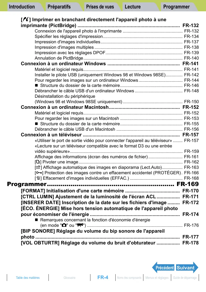 : Non applicable. Suivant Table des matières Glossaire FR-193 Noms des composants Menus et réglages Guide de dépannage Introduction Préparatifs Mode Prises de vues Lecture Après ARRÊT Menu