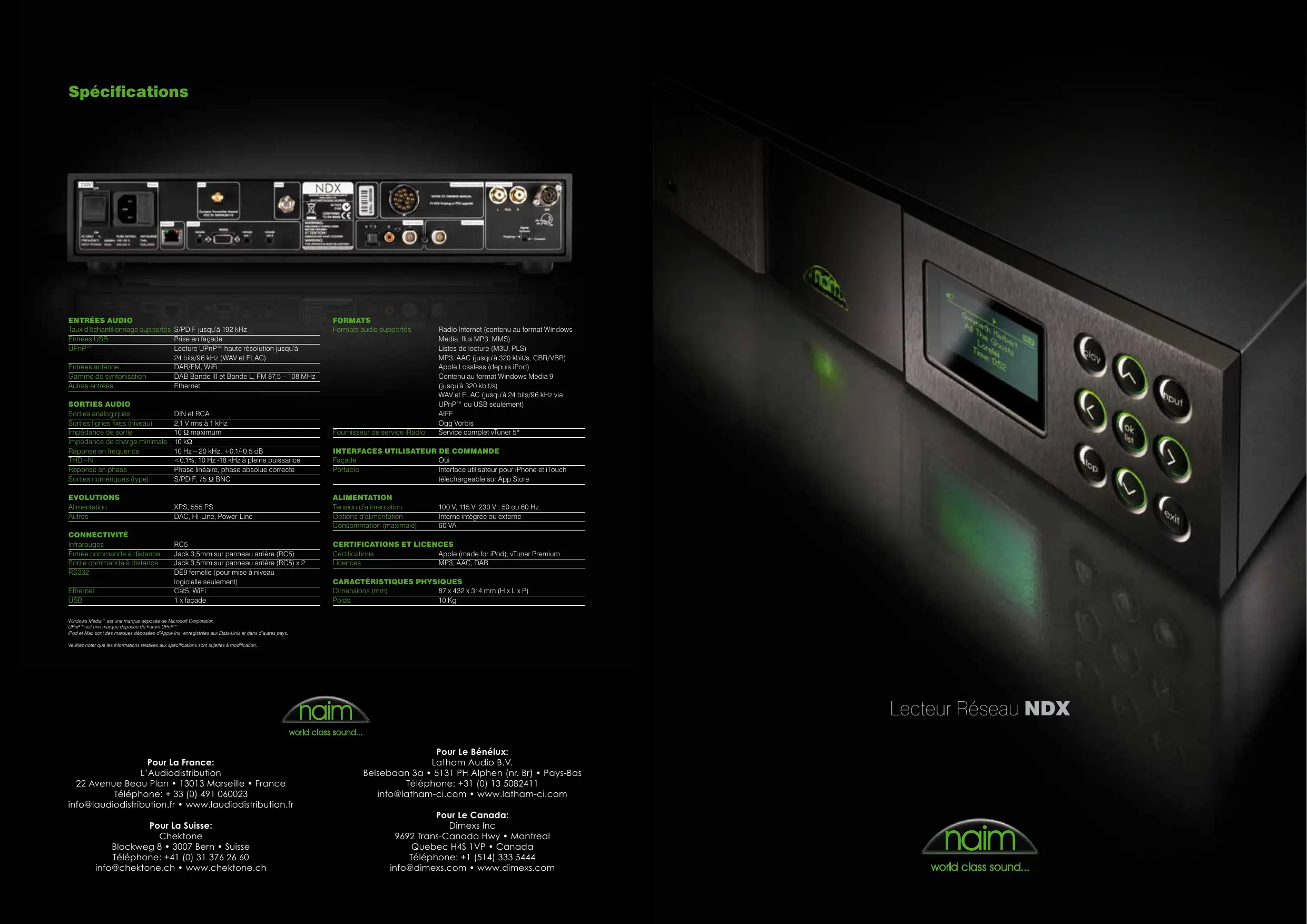 Connectez un NDX à votre système audio existant et vous serez prét à découvertir le monde de l'audio en réseau : celui des téléchargesements audio en haute résolution, du streaming UPnP™ et des vastes ressources de la radio Internet. Grâce à la technologie de Naim, c'est aussi un monde où la restitution sonore est de très haute qualité, où la musique ne se contente pas d'être en arrêté-plan mais où elle vit, respire et communique