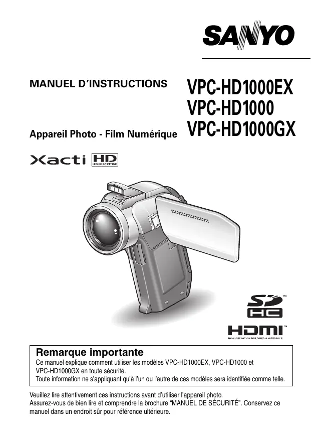 Ce manuel explique comment utiliser les modèles VPC-HD1000EX, VPC-HD1000 et