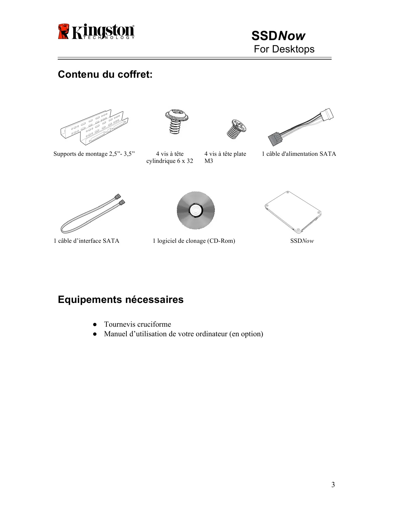 Félicitations ! Vous venez d’acquérir une carte SSDNow signée Kingston Technology. Cette carte a été conçue pour vous permettre d’optimiser les performances et la fiabilité de votre ordinateur de bureau. Vous trouverez dans ce coffret tous les accessoires matériels et logiciels nécessaires au remplacement de votre disque dur actuel par votre carte SSDNow. Vous bénéficierez notamment du programme de clonage Acronis® True Image HD qui vous aidera à copier tout le contenu de votre disque dur – aussi bien votre système d’exploitation que vos fichiers et dossiers – et de le transférer intégralement vers votre carte SSDNow. Une fois cette opération réalisée, vous pourrez utiliser votre ancien disque dur comme espace de stockage d’appoint.