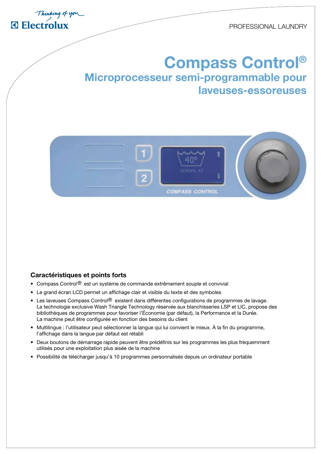- Les laveuses Compass Control® existent dans différentes configurations de programmes de lavage. La technologie exclusive Wash Triangle Technology réservée aux blanchisseries LSP et LIC, propose des bibliothèques de programmes pour favoriser l'Économie (par défaut), la Performance et la Durée. La machine peut être configurée en fonction des besoin du client