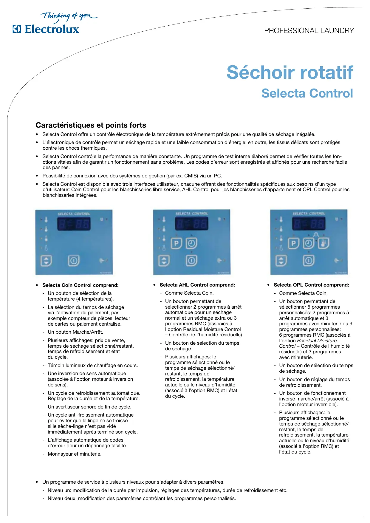 - Selecta Control est disponible avec trois interfaces utilisateur, chacune offrant des fonctionnalités spécifiques aux besoin d'un type d'utilisateur: Coin Control pour les blanchisseries libre service,AHL Control pour les blanchisseries d'appartement et OPL Control pour les blanchisseries integrees.