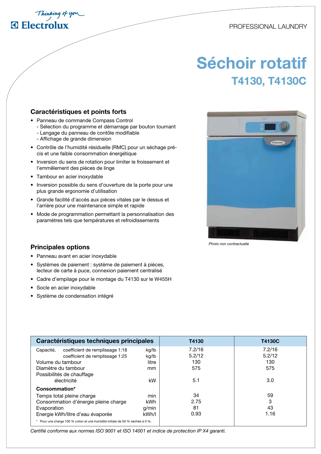 - Pour une charge 100 % coton et une humidité initiale de 50 % séchée à 0 %. Certifié conforme aux normes ISO 9001 et ISO 14001 et indice de protection IP X4 garanti. T4130 T4130C kW(A) kW(A) kW(A)