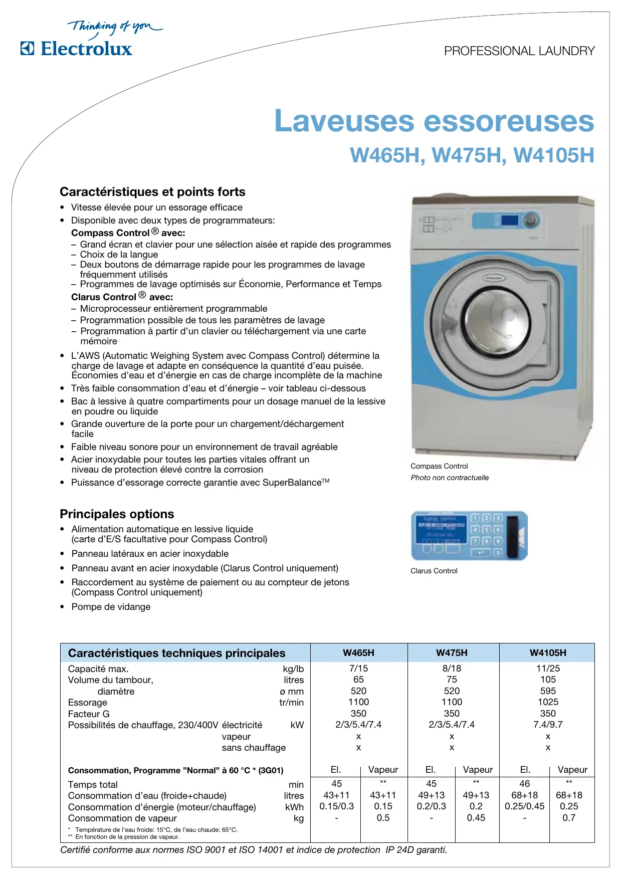 PROFESSIONAL LAUNDRY Laveuses essoreuses W465H, W475H, W4105H Caractéristiques et points forts