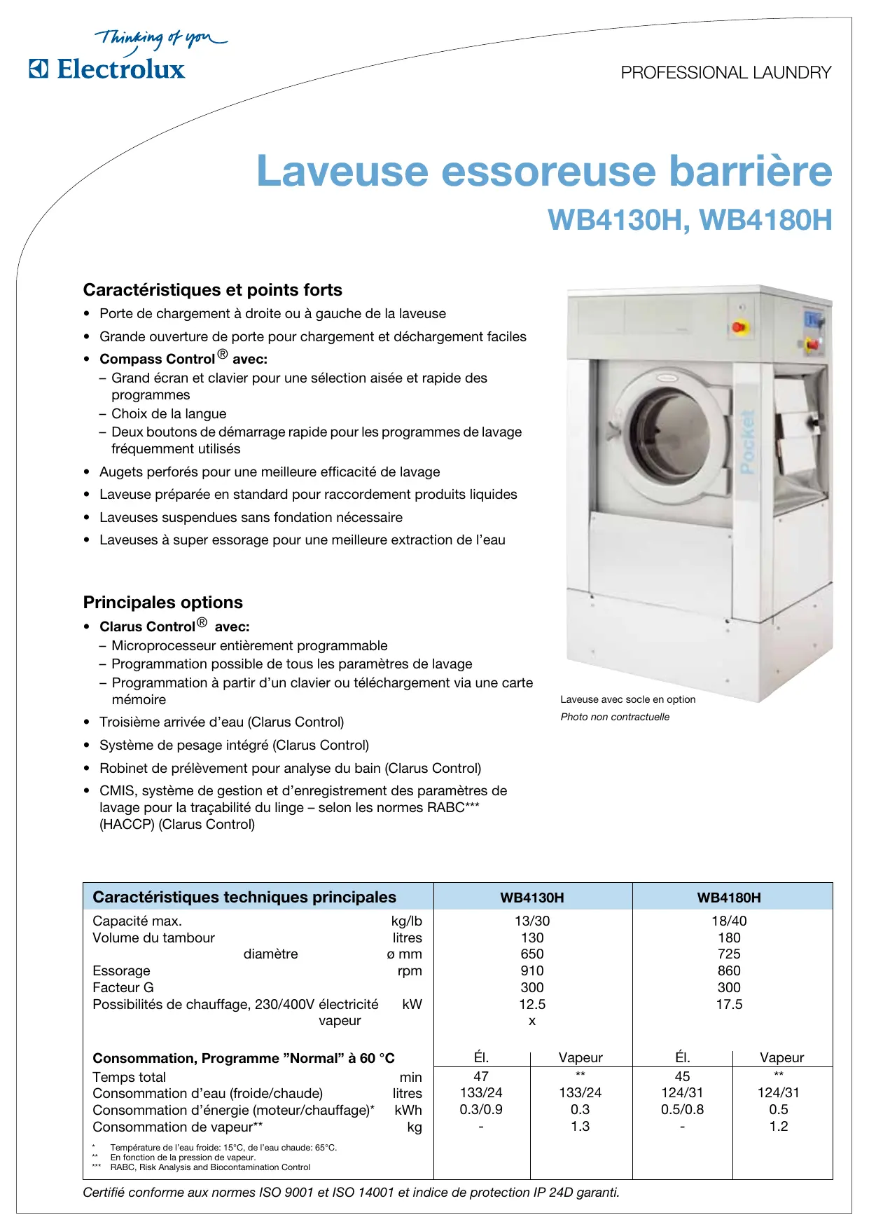 - CMIS, système de gestion et d’enregistrement des paramètres de lavage pour la traçabilité du linge – selon les normes RABC*** (HACCP) (Clarus Control) Caractéristiques techniques principales WB4130H WB4180H 13/30