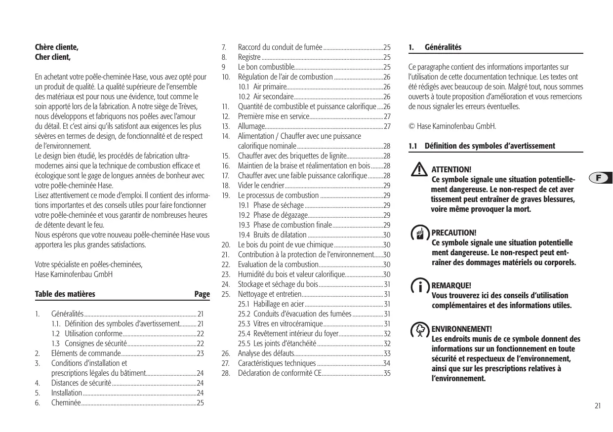 écologique sont le gage de longues années de bonheur avec votre poêle-cheminée Hase. Lisez attentivement ce mode d‘emploi. Il contient des informations importantes et des conseils utiles pour faire fonctionner votre poêle-cheminée et vous garantir de nombreuses heures de détente devant le feu. Nous espérons que votre nouveau poêle-cheminée Hase vous apportera les plus grandes satisfactions. Votre spécialiste en poêles-cheminées, Hase Kaminofenbau GmbH Table des matières 1.
