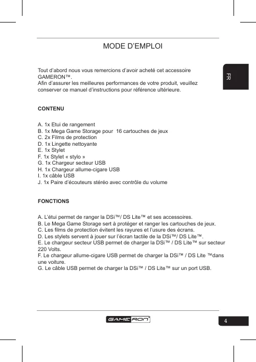 Tout d’abord nous vous remercions d’avoir acheté cet accessoire GAMERON™. Afin d’assurer les meilleures performances de votre produit, veuillez conserver ce manuel d’instructions pour référence ultérieure. CONTENU A. 1x Etui de rangement B. 1x Mega Game Storage pour 16 cartouches de jeux C. 2x Films de protection D. 1x Lingette nettoyante E. 1x Stylet F. 1x Stylet « stylo » G. 1x Chargeur secteur USB H. 1x Chargeur allume-cigare USB